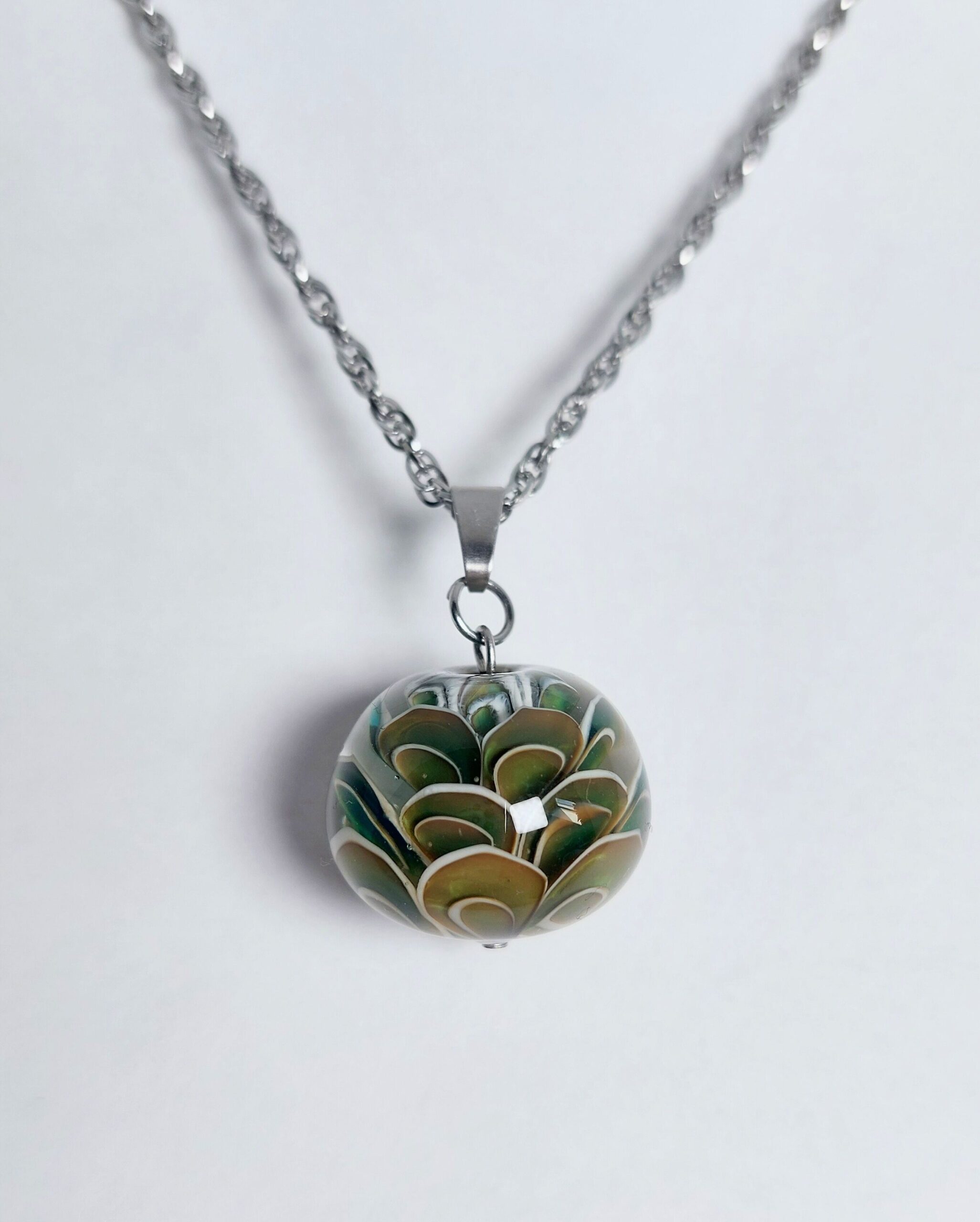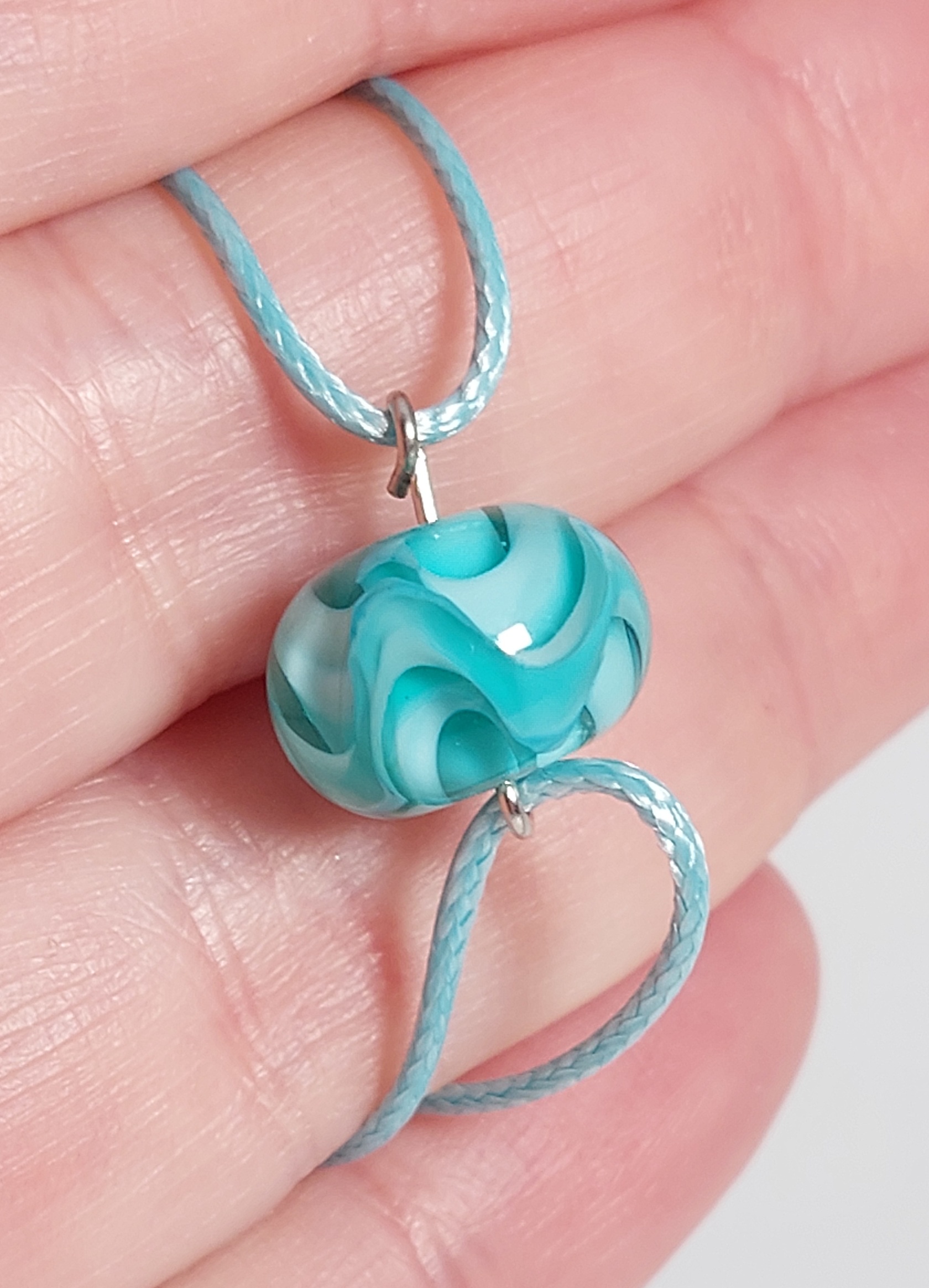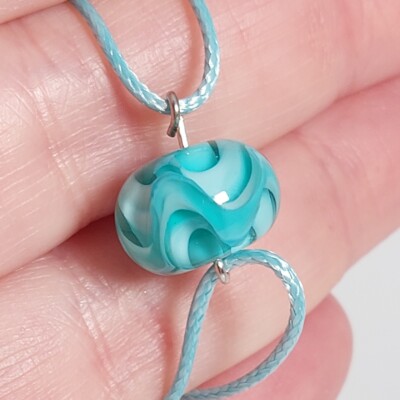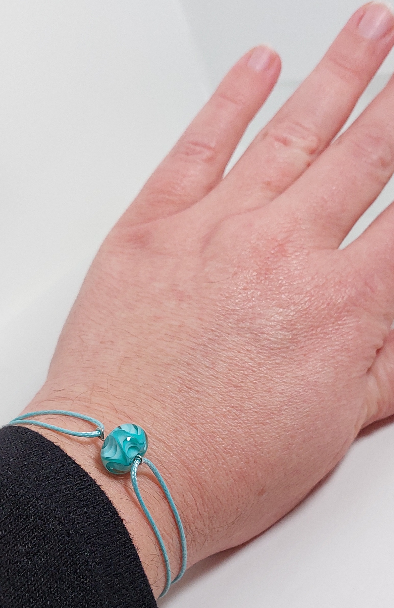 Deze kleur laat zich niet zo goed vangen op een foto. In het echt neigt de kleur van de glaskraal iets meer naar zeegroen.