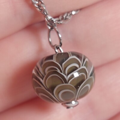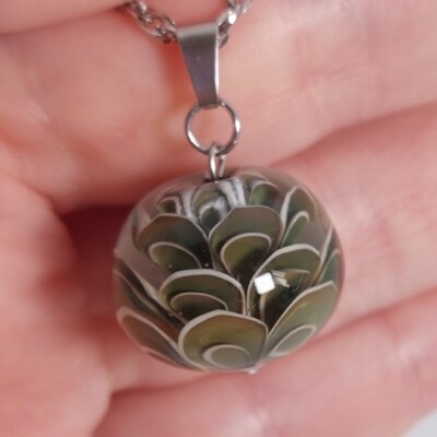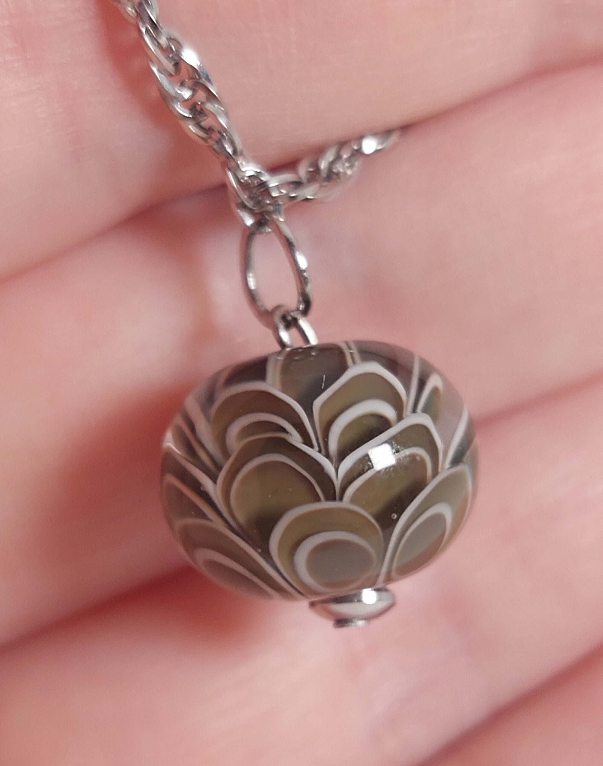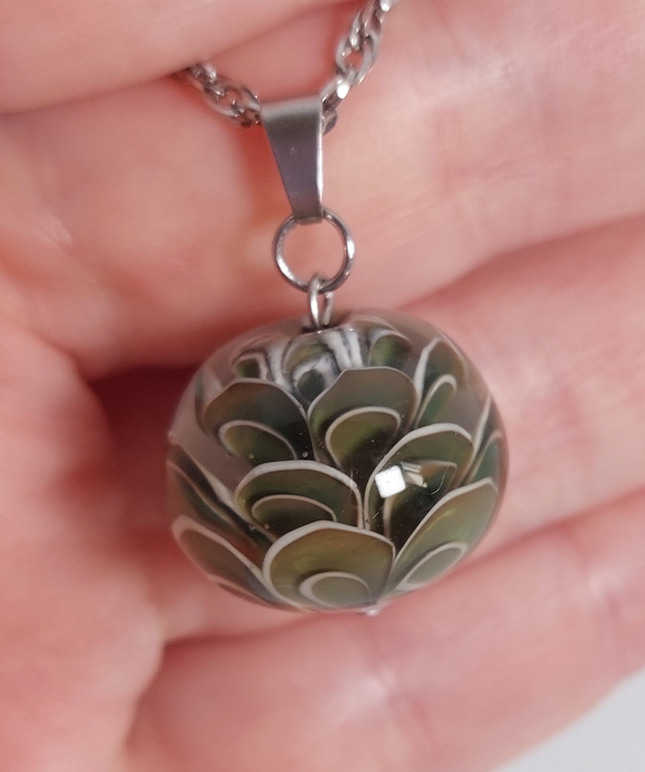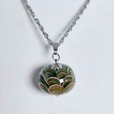 Deze kleur laat zich niet zo goed vangen op een foto. In het echt neigt de kleur van de glaskraal iets meer naar zeegroen.