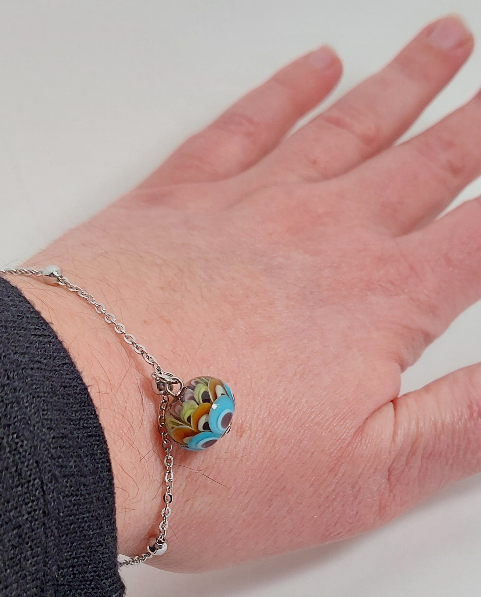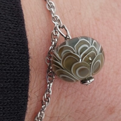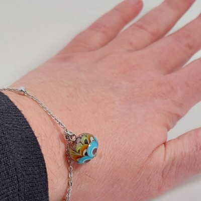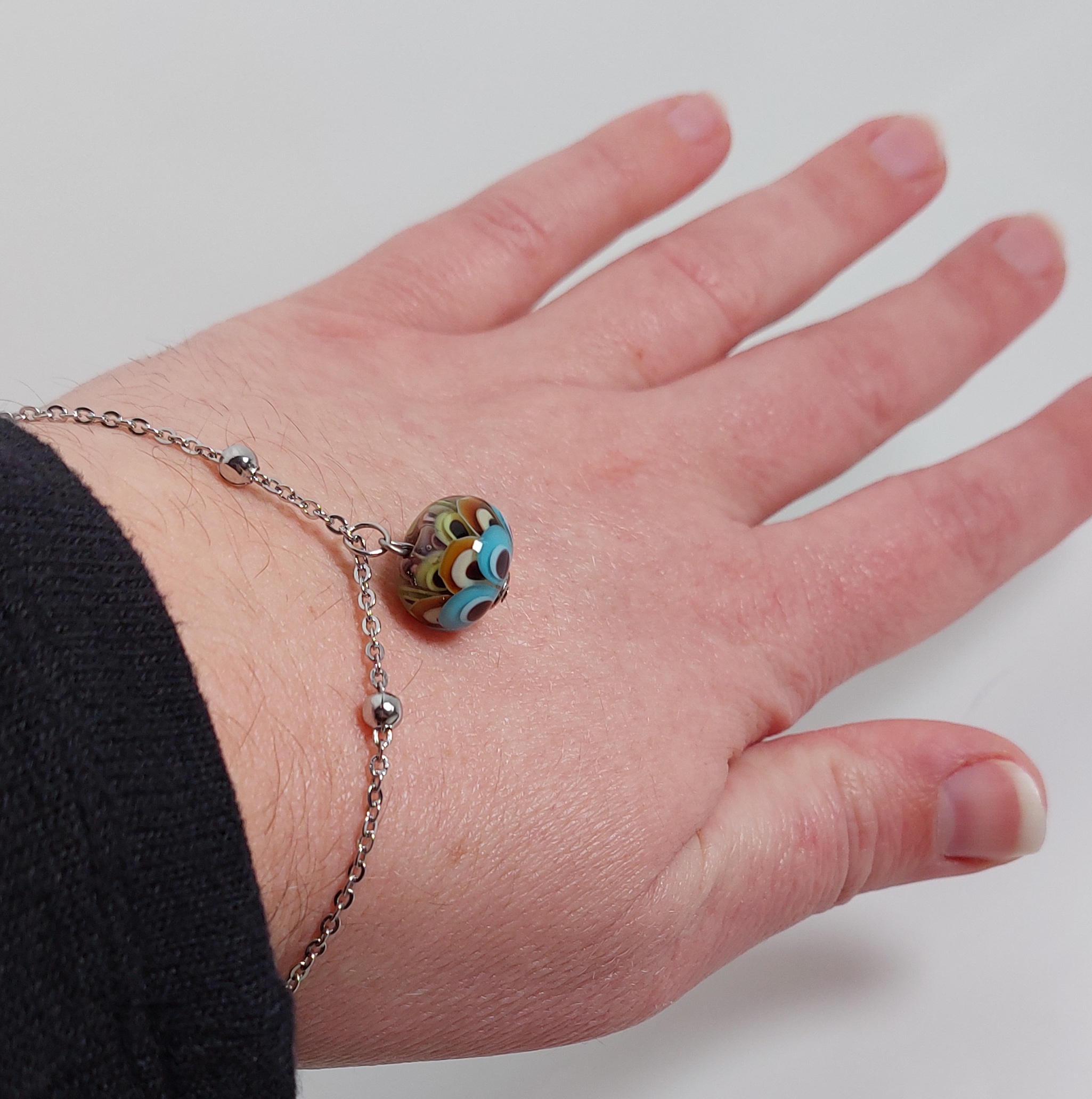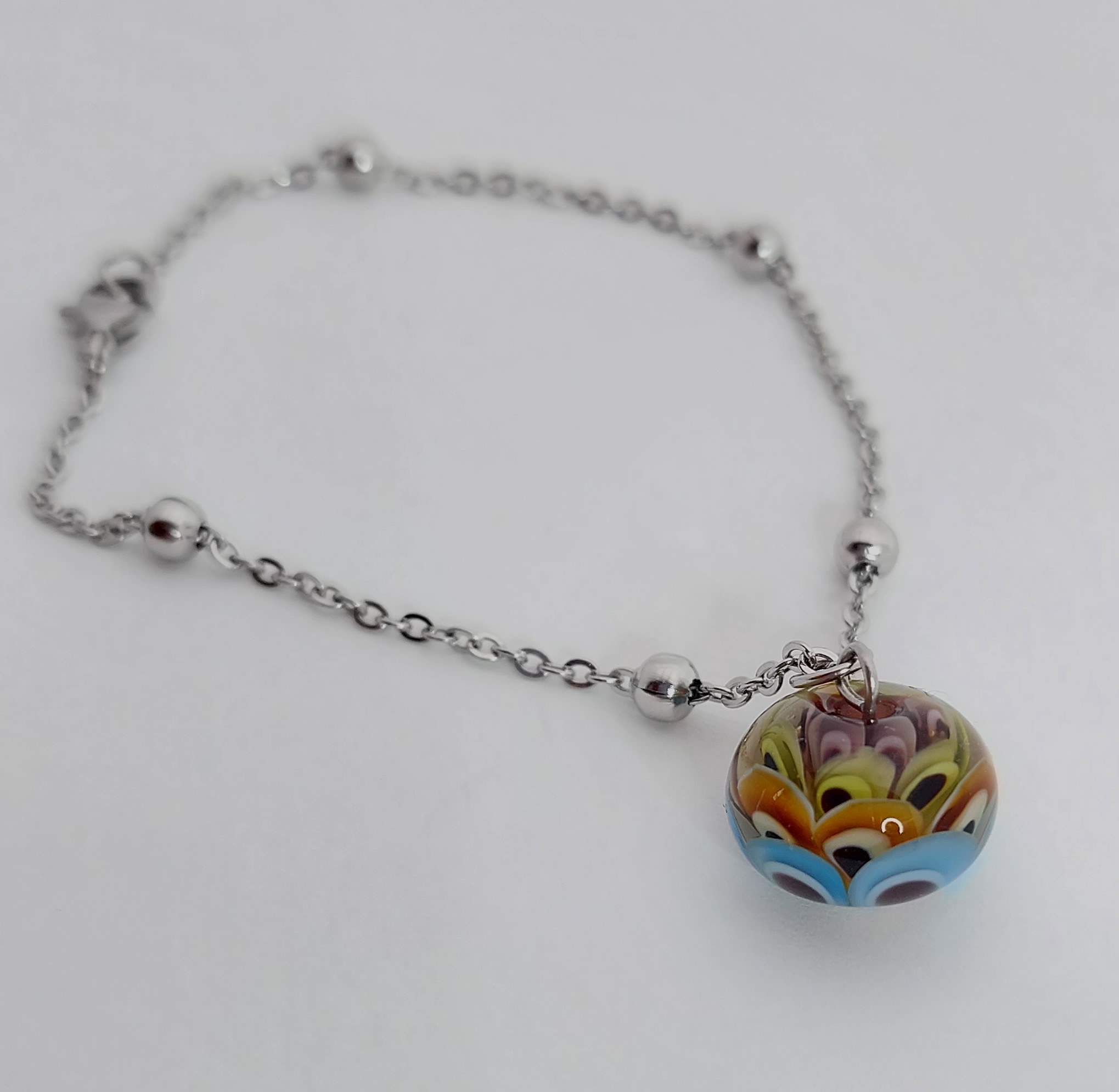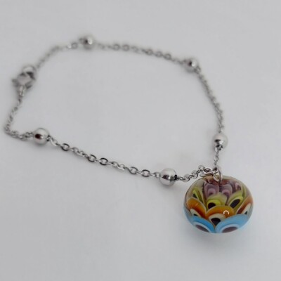 De armband/ketting is gemaakt van stainless steel met een karabijnsluiting en natuurlijk de glaskraal als blikvanger.