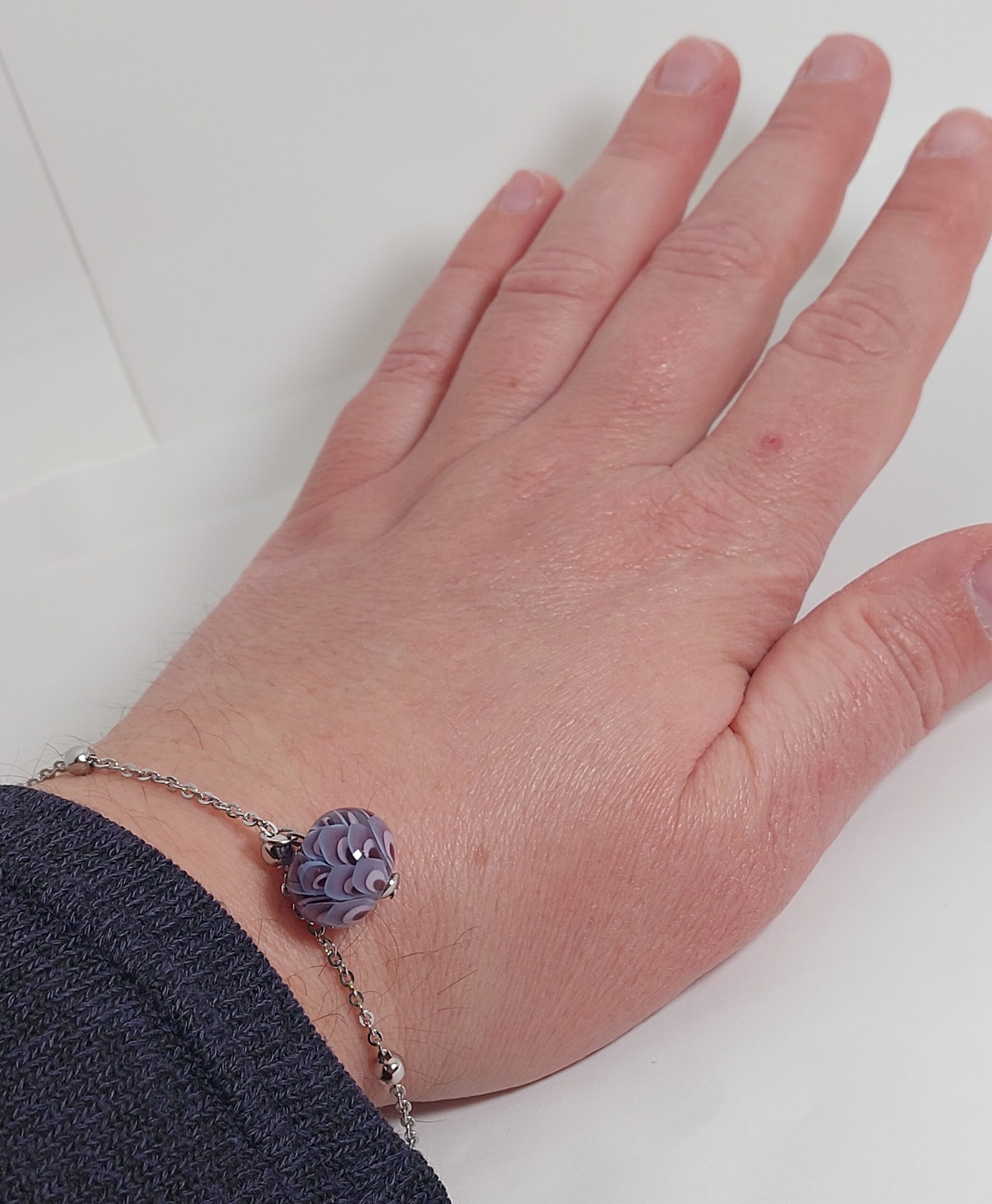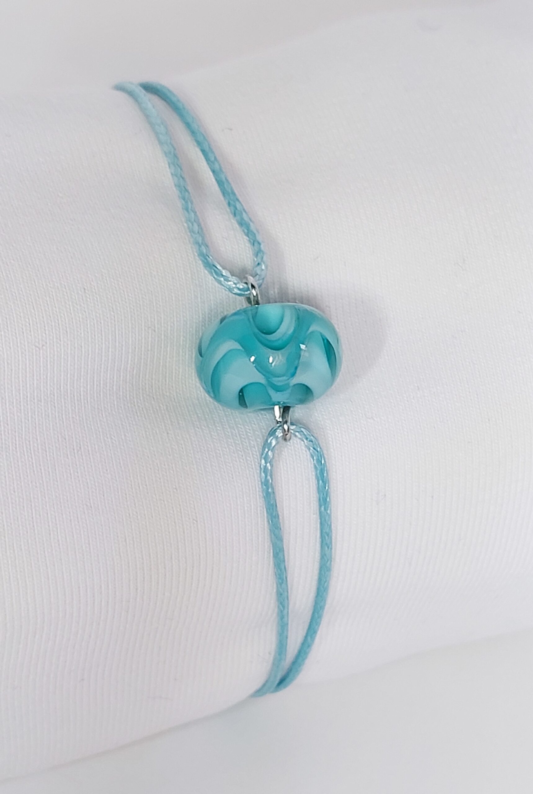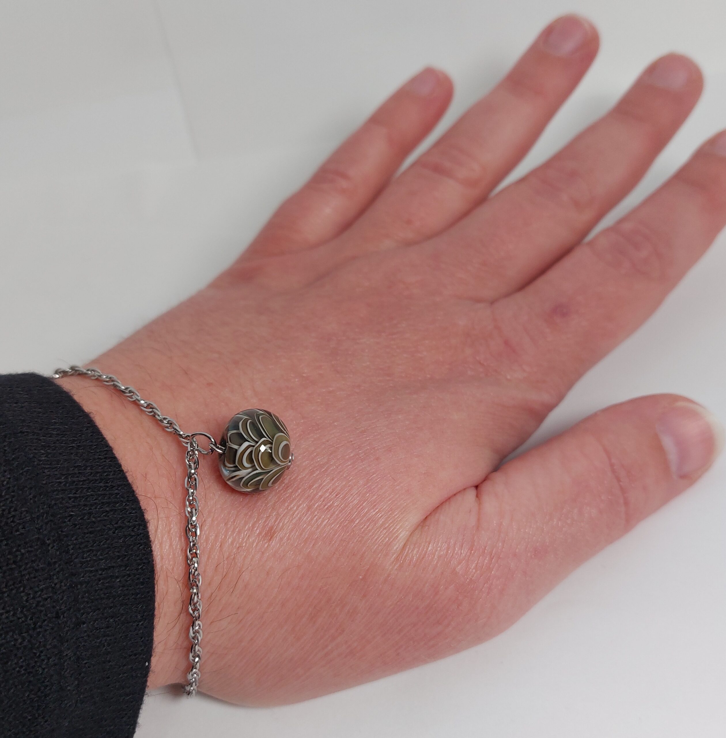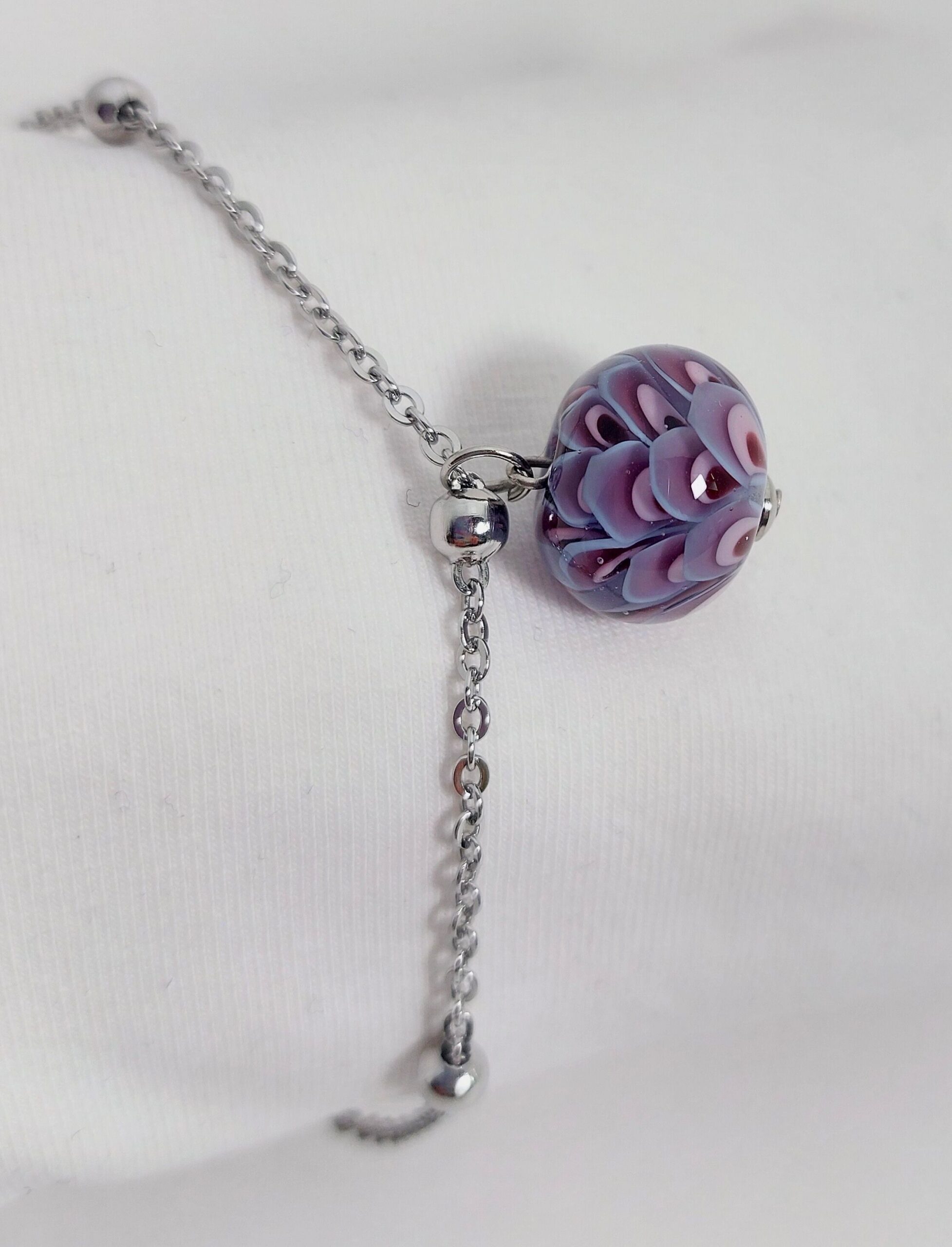 De armband/ketting is gemaakt van stainless steel met een karabijnsluiting en natuurlijk de glaskraal als blikvanger.