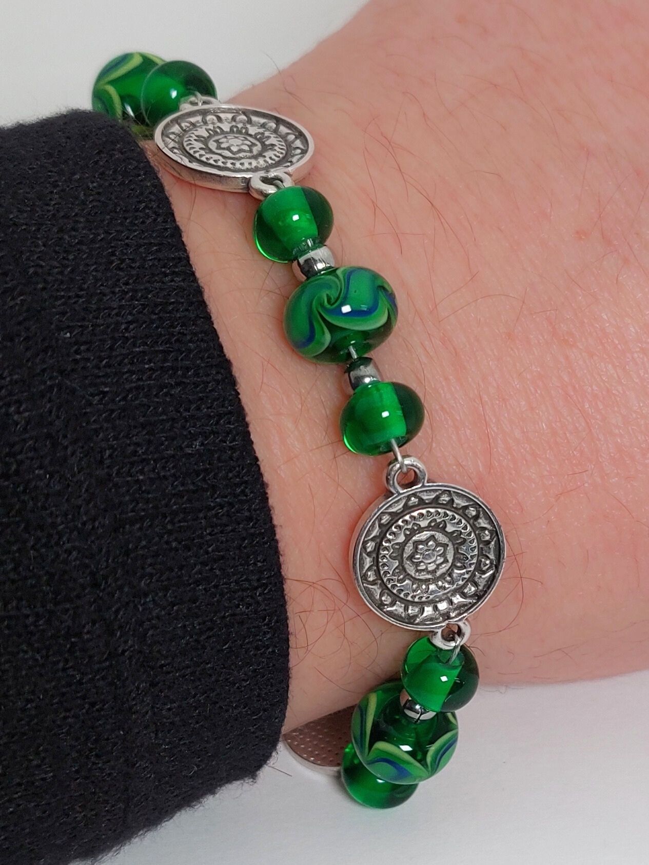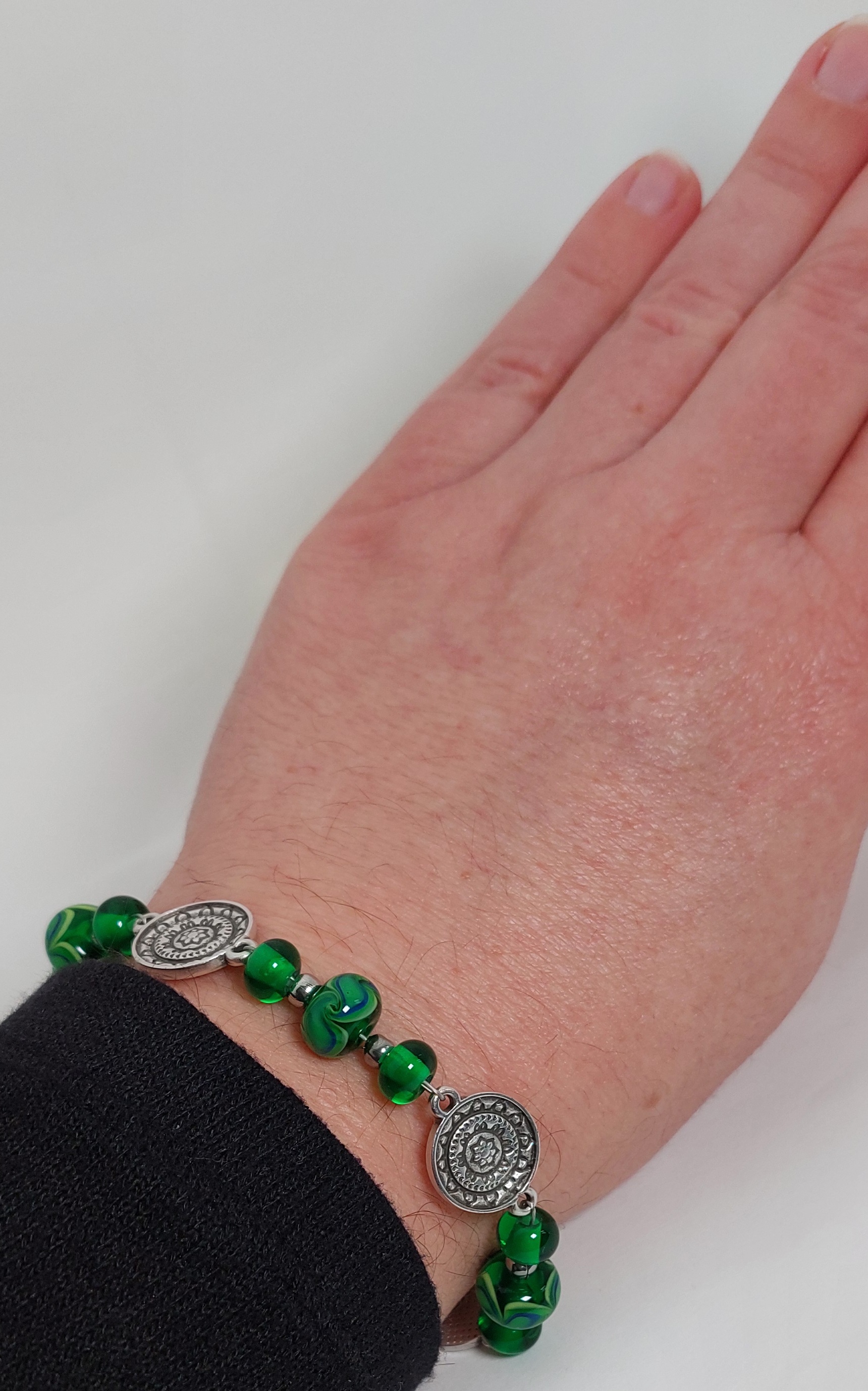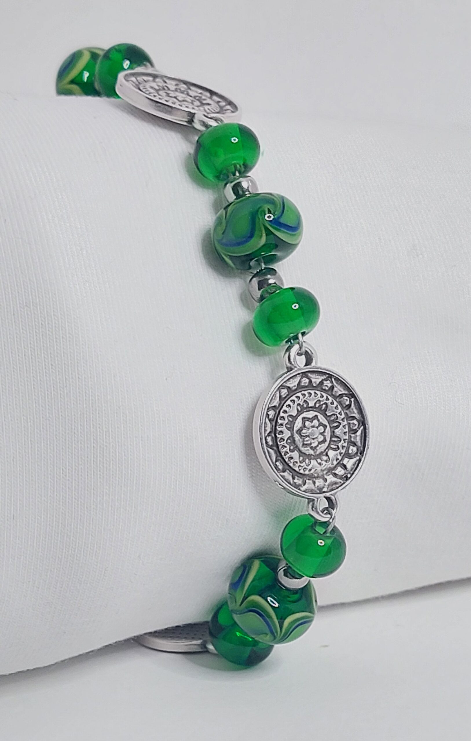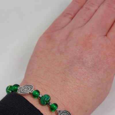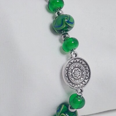 Deze unieke armband is gemaakt van groene glaskralen waar een blauw accent in verwerkt is, met DQ tussenzetsels. De overige onderdelen zijn van stainless steel.