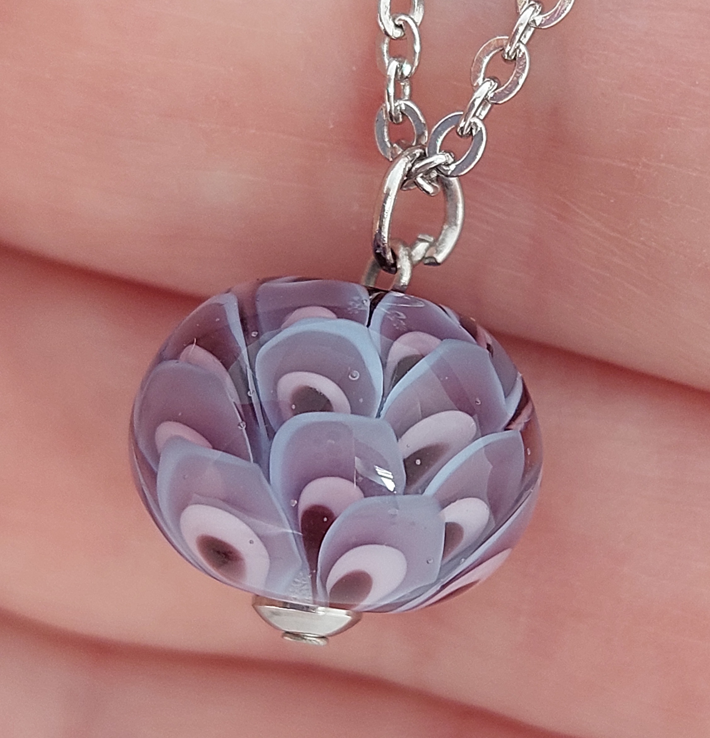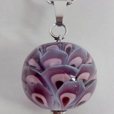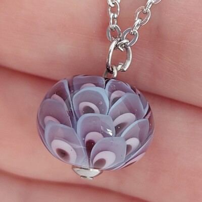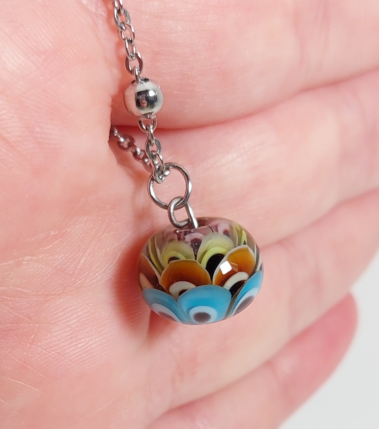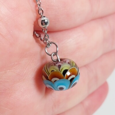 De glaskraal is gemaakt met de kleuren amethist, amber, groen en lichtblauw.