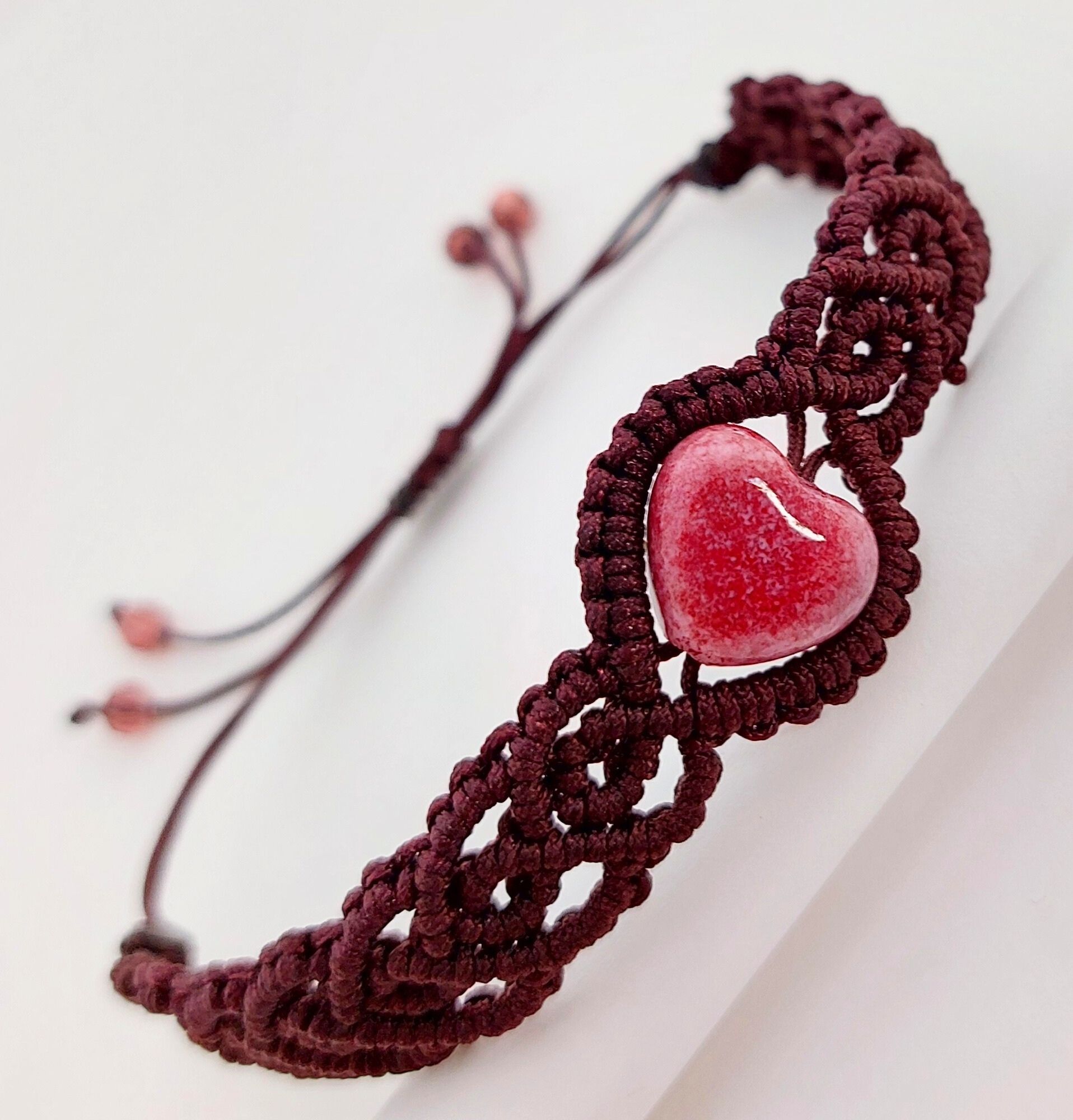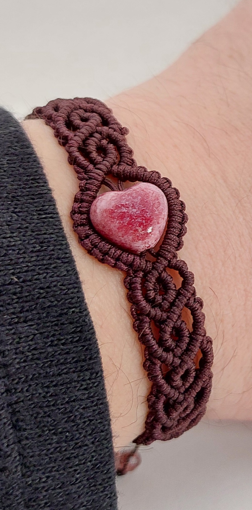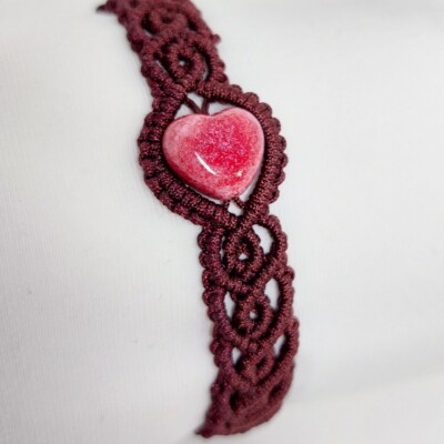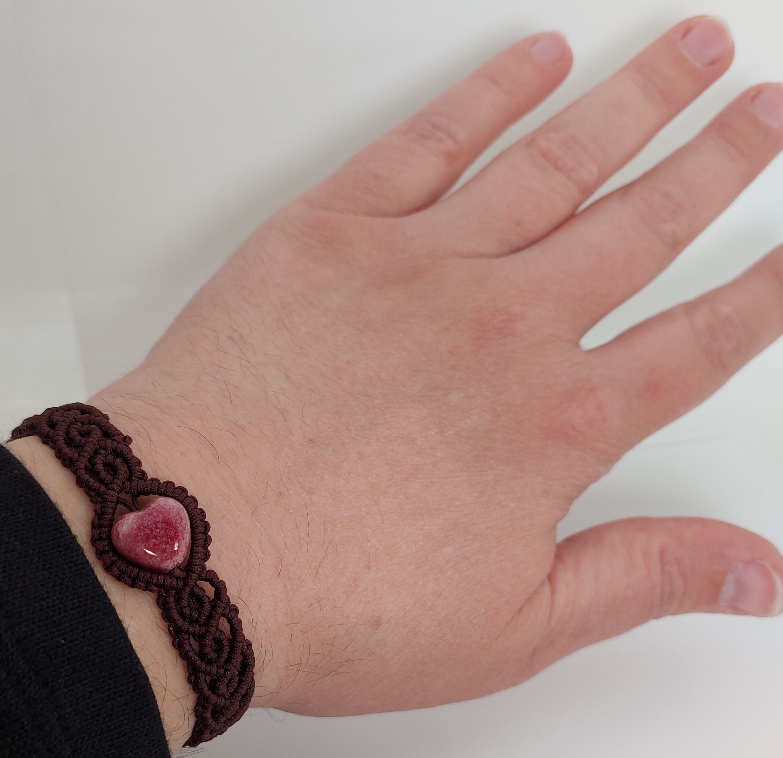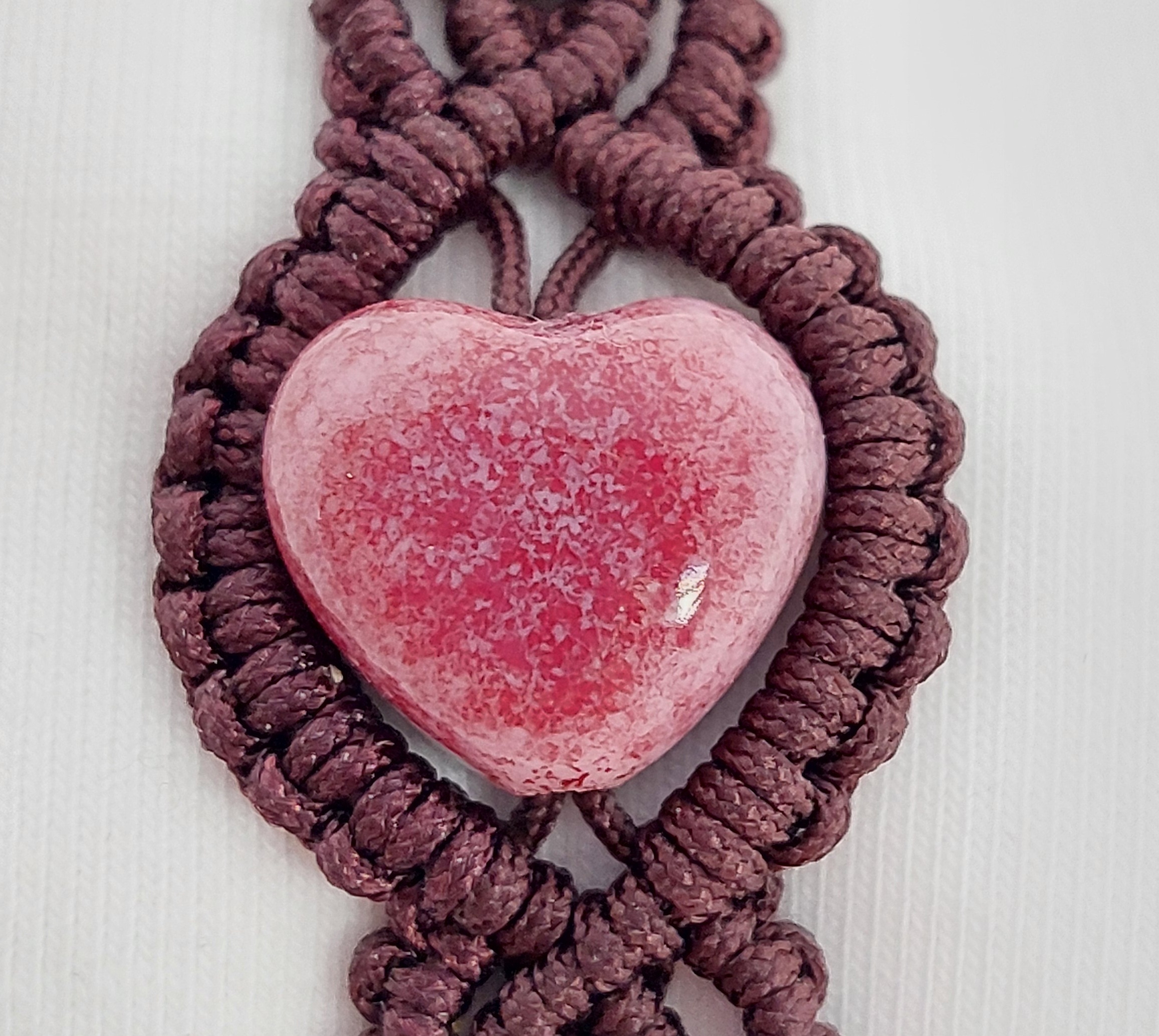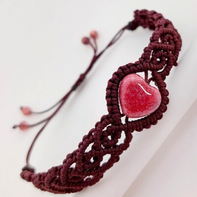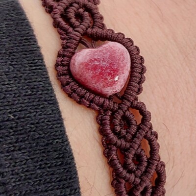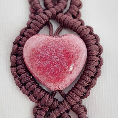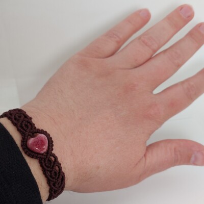 Donkerbruine macramé armband met roze, hartvormige glaskraal