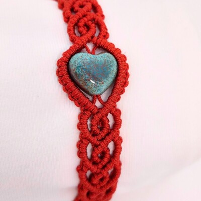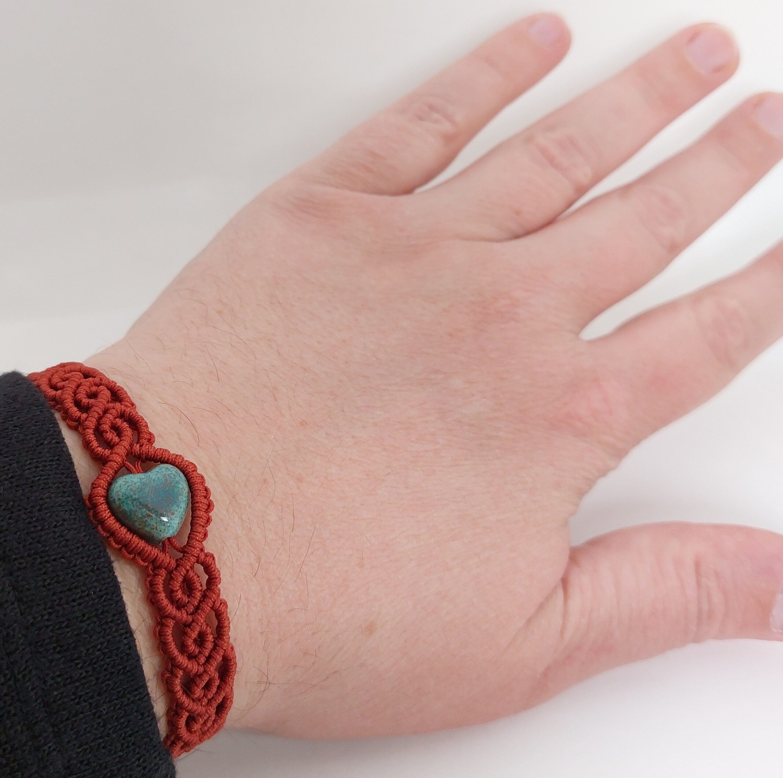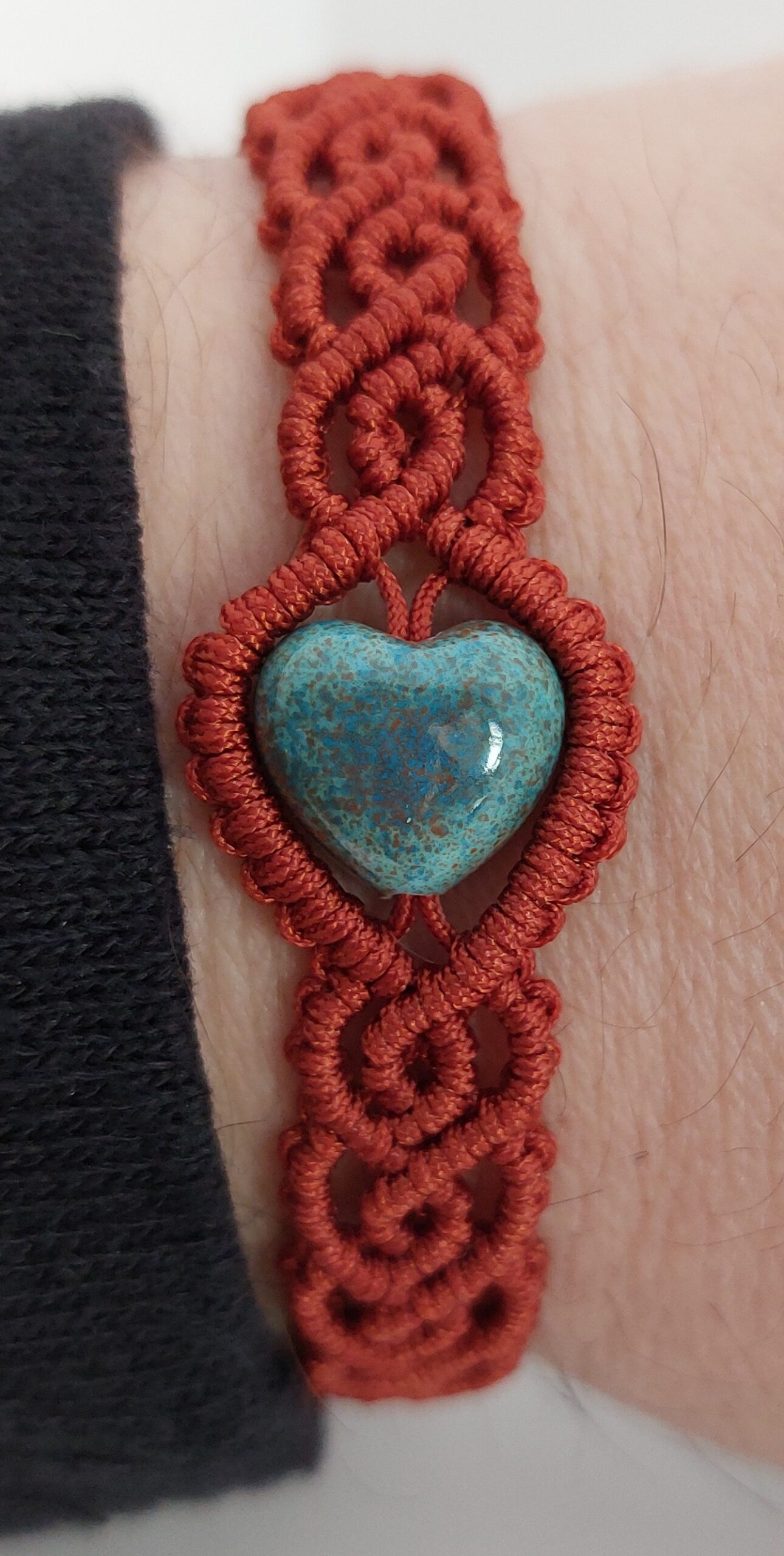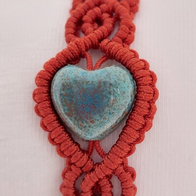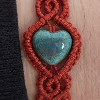 Koperkleurige macramé armband met turquoise, hartvormige glaskraal