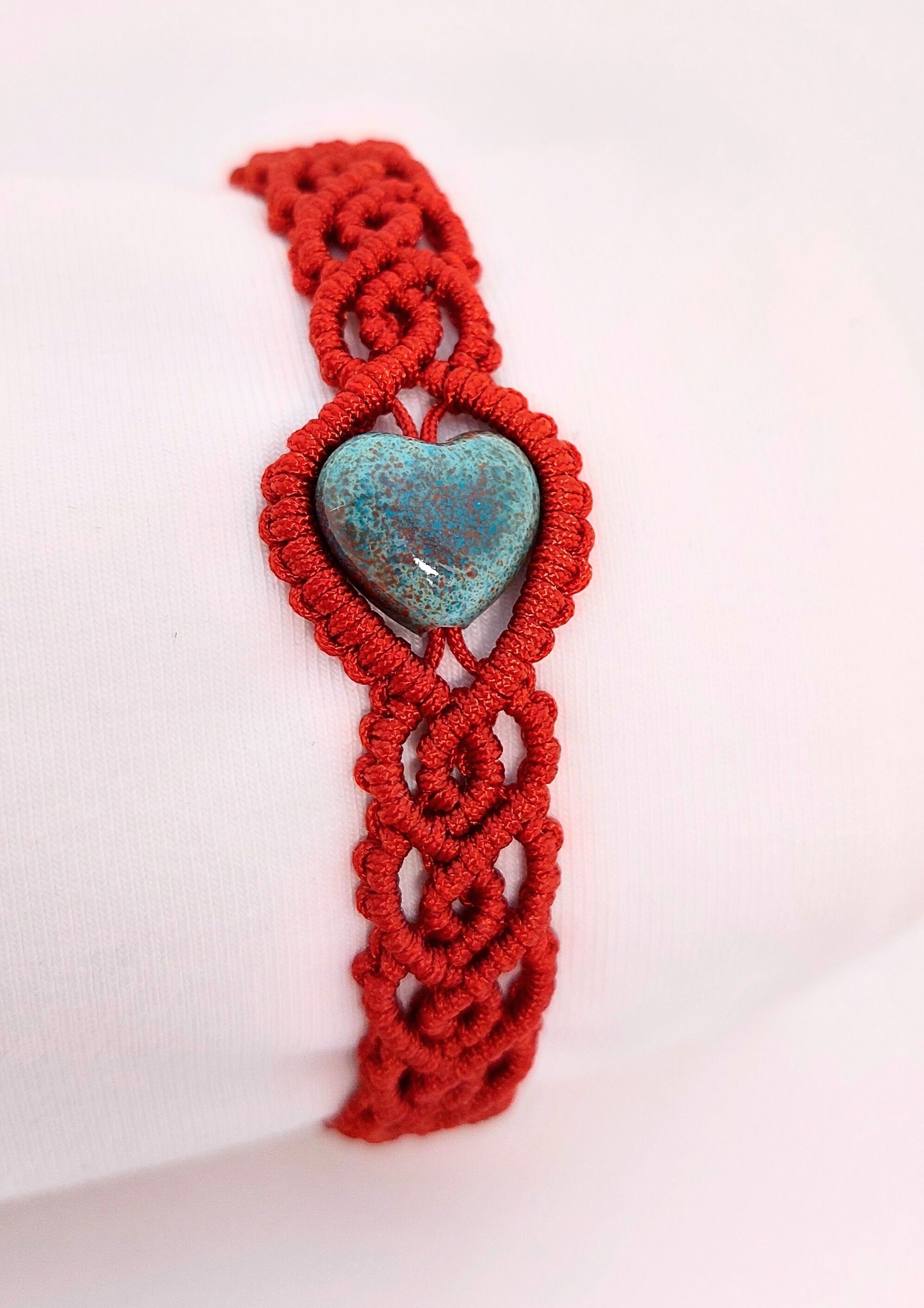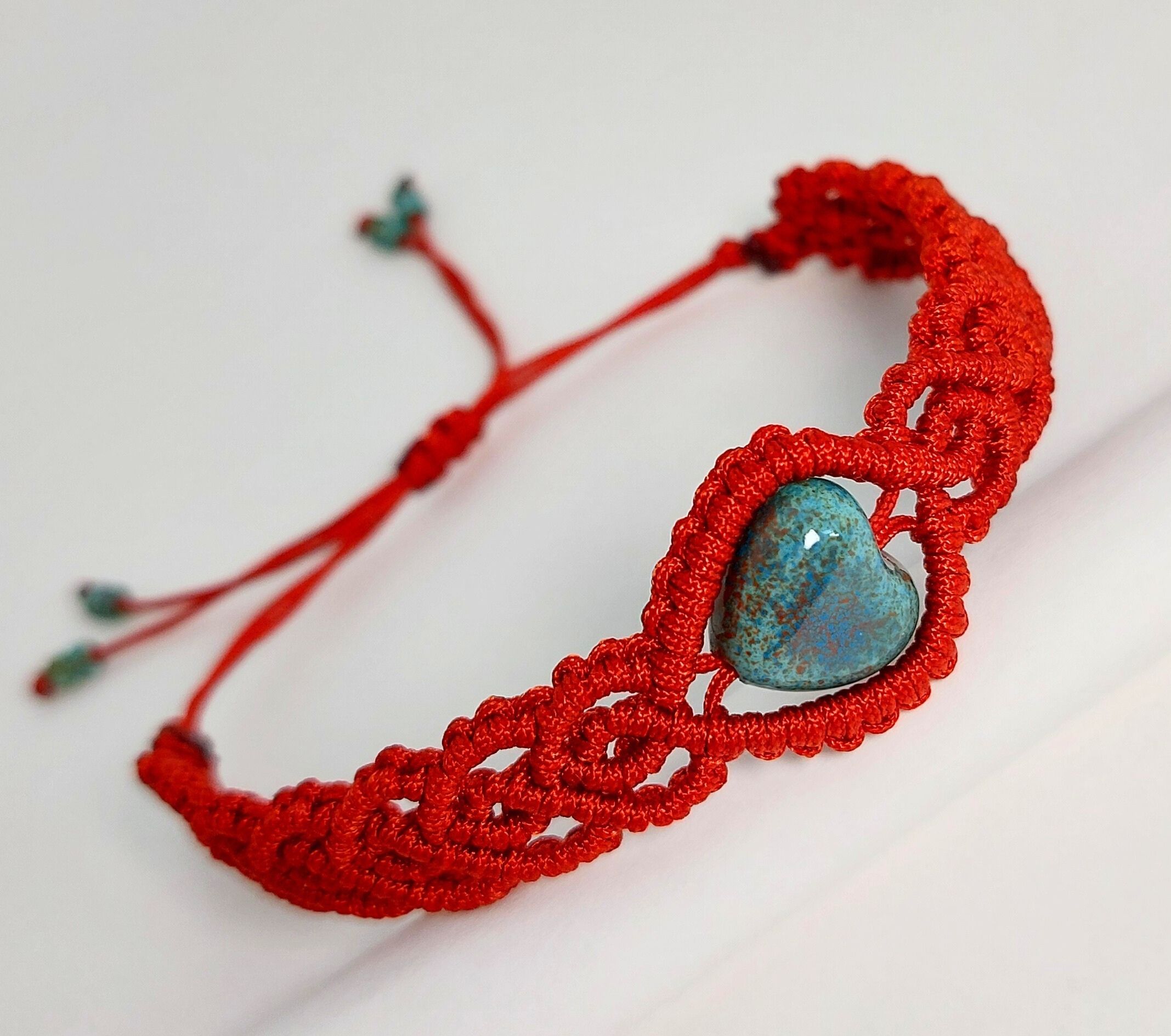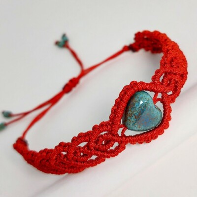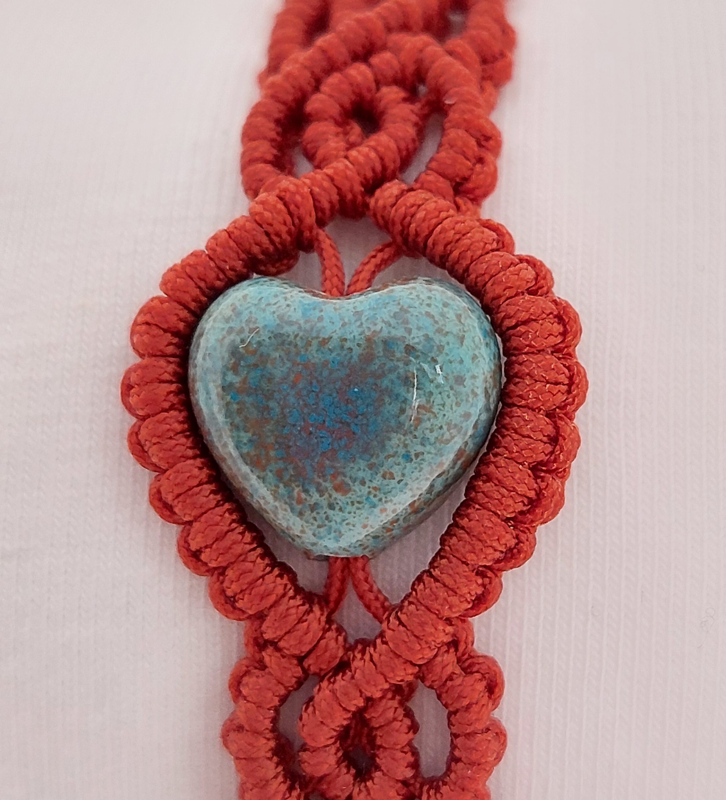 Koperkleurige macramé armband met turquoise, hartvormige glaskraal
