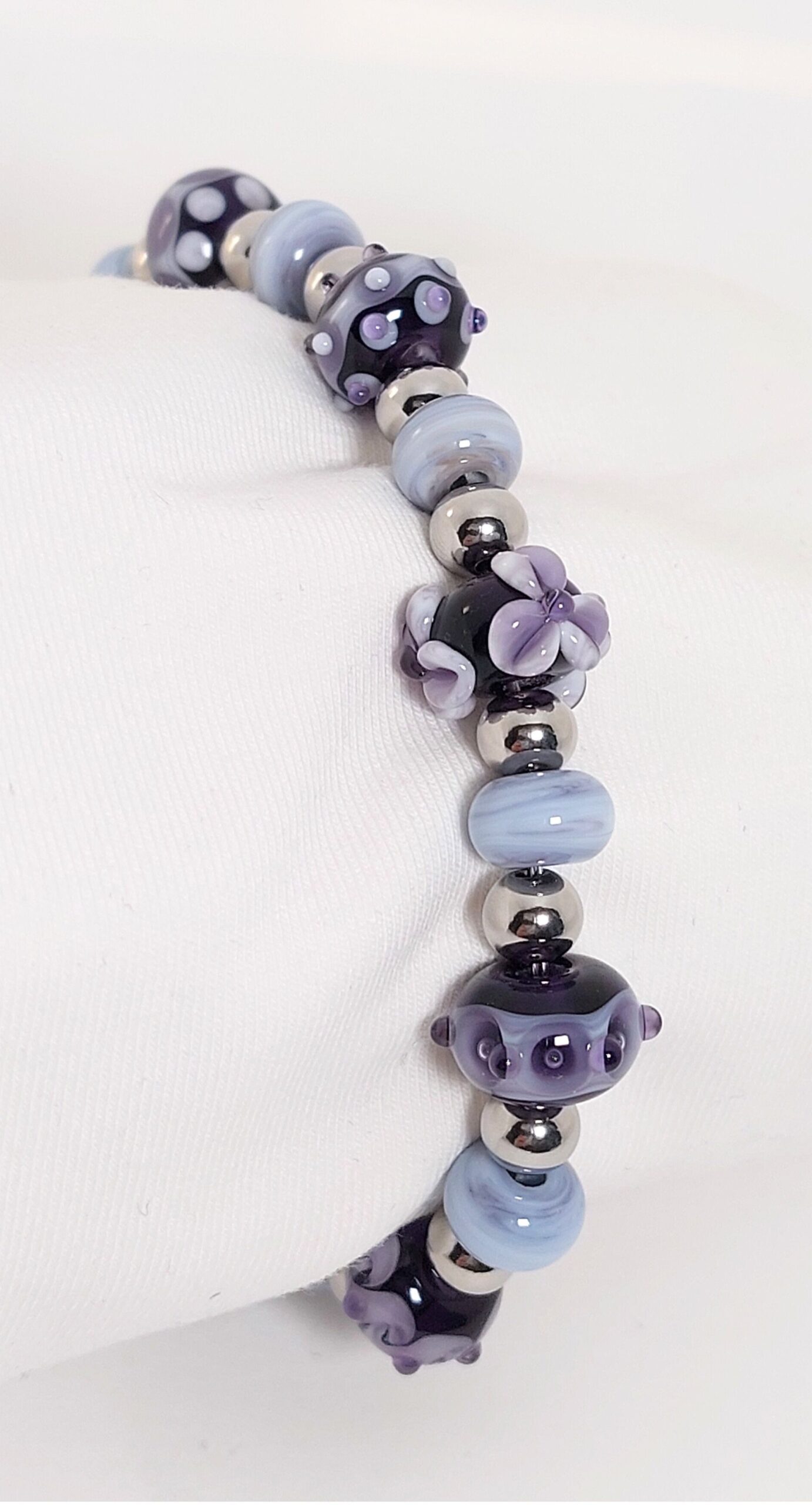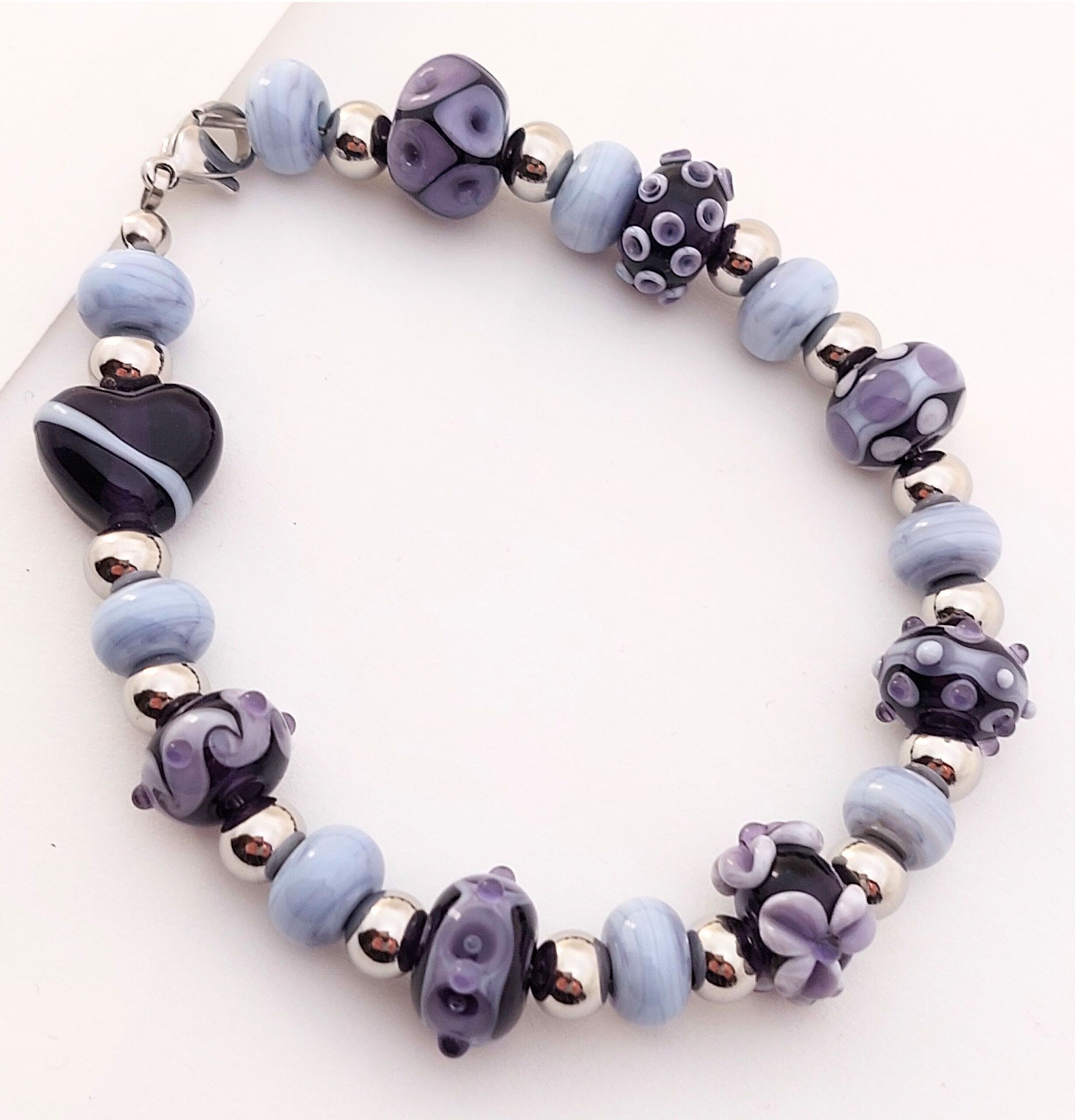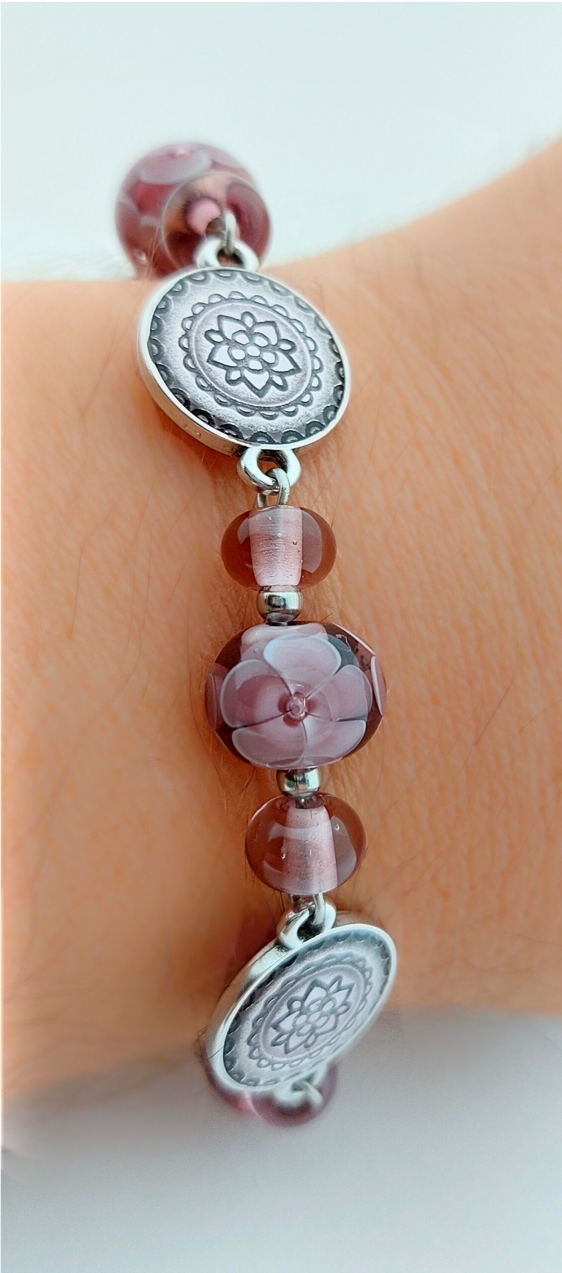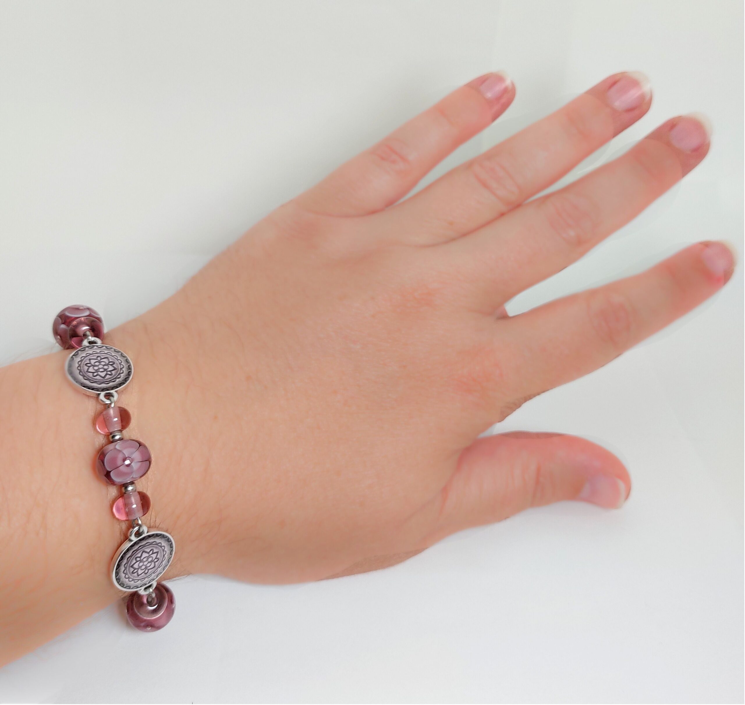 Deze armband is gemaakt van paarse glaskralen met verschillende decoraties. De zilverkleurige kralen en afwerking zijn rvs.