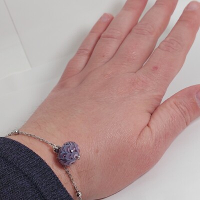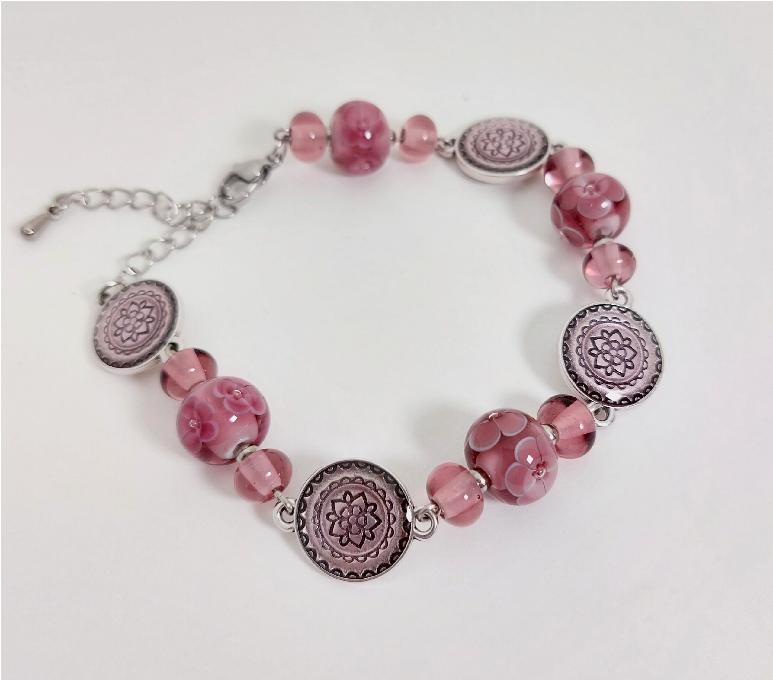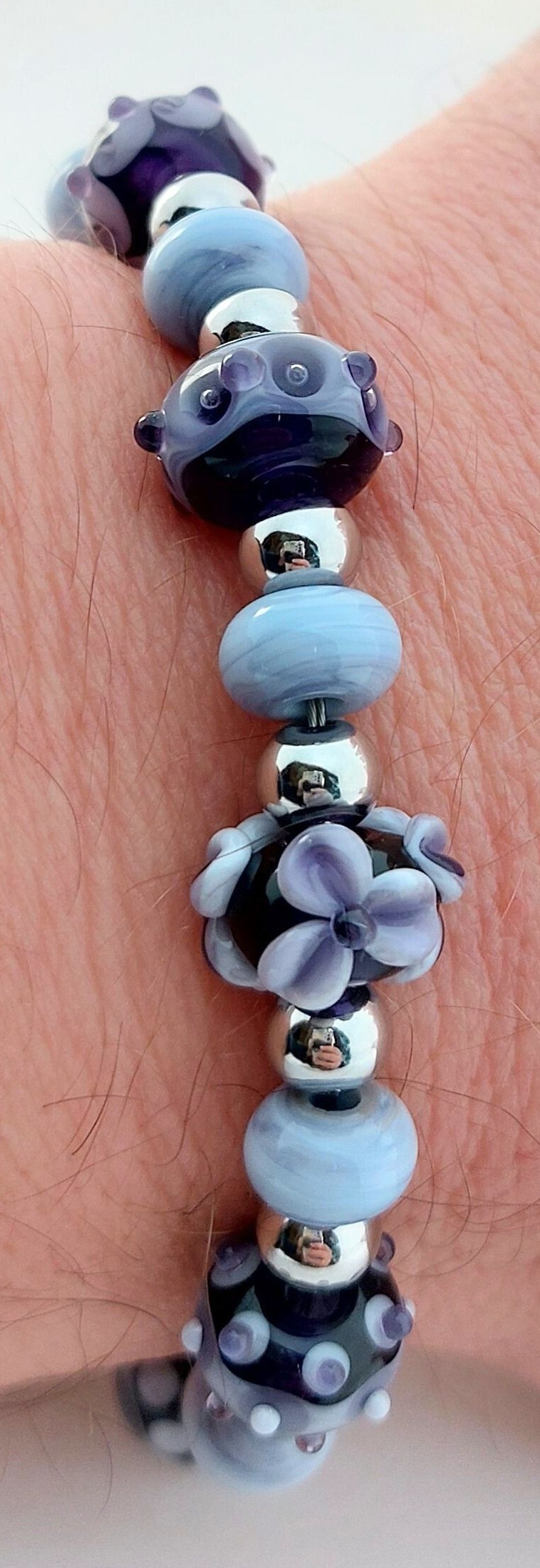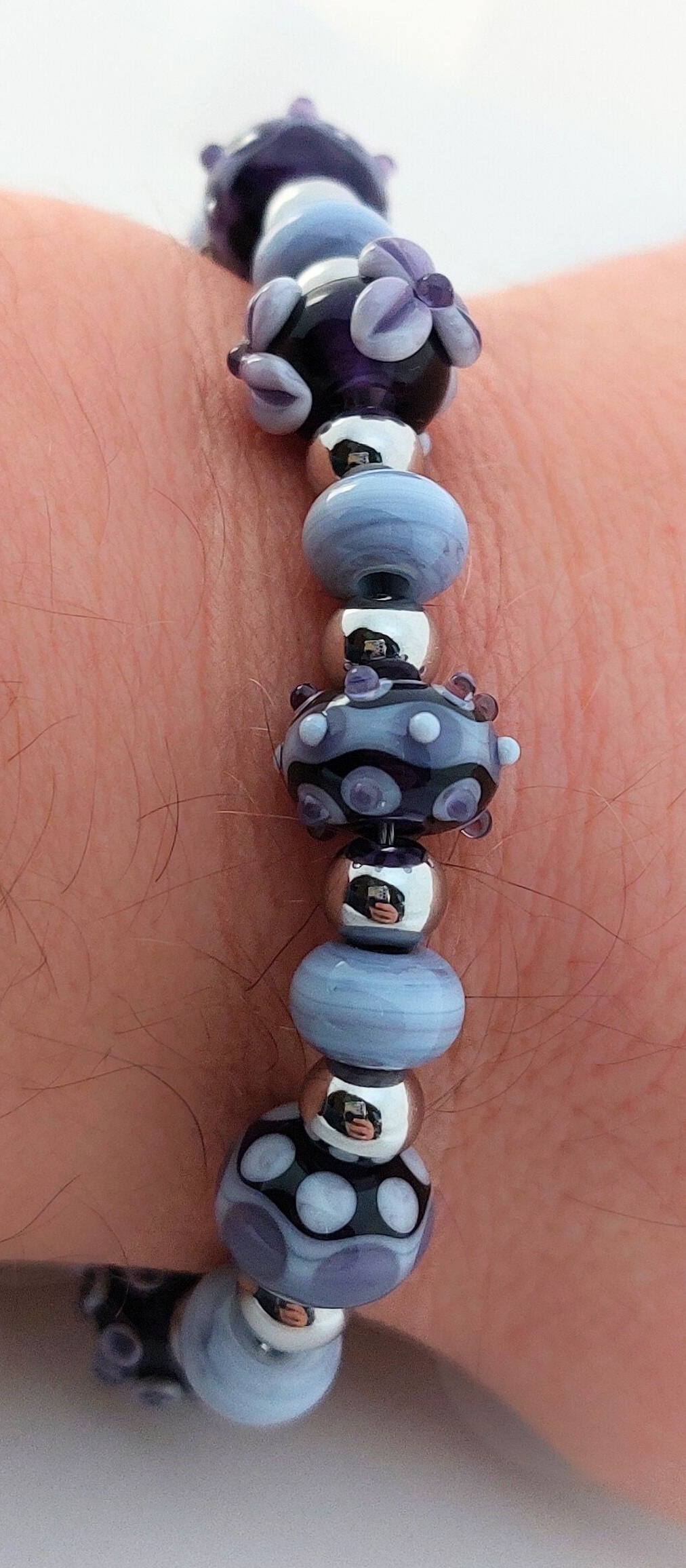 Deze armband is gemaakt van paarse glaskralen met verschillende decoraties. De zilverkleurige kralen en afwerking zijn rvs.