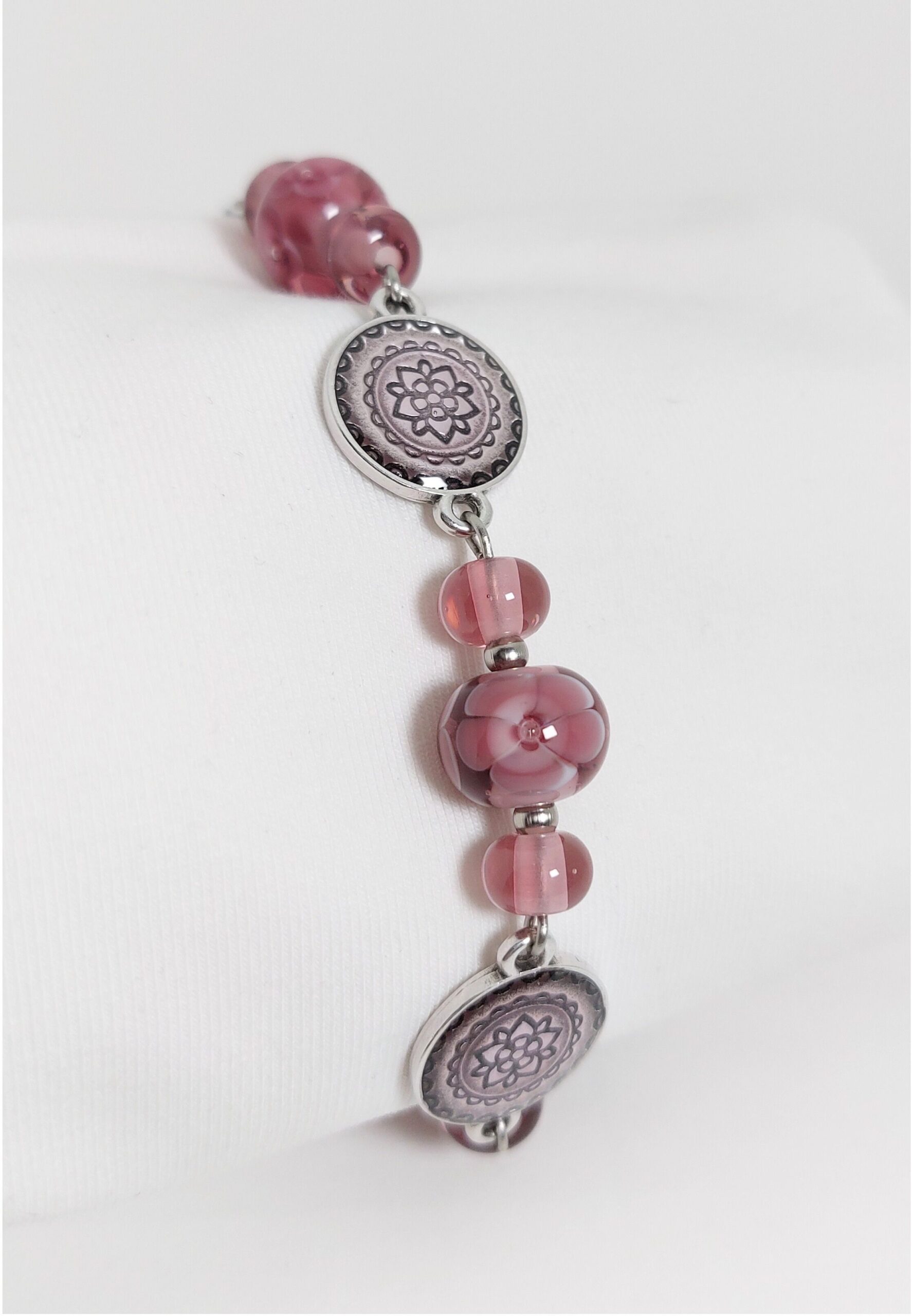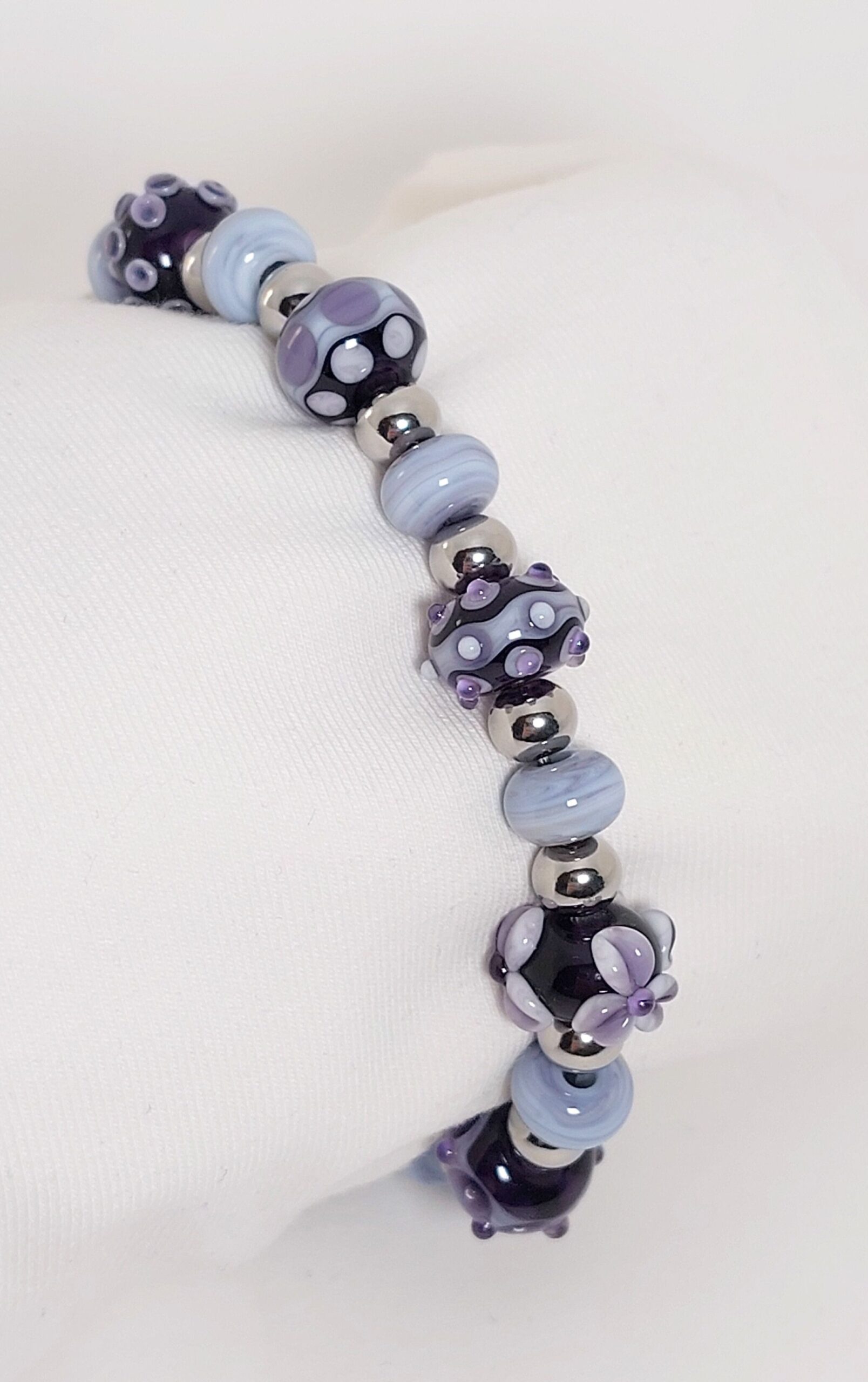 Deze unieke armband is gemaakt van handgemaakte glaskralen met DQ tussenstukjes. De glaskralen zijn gemaakt met een kleur die ‘amethist’ genoemd wordt.