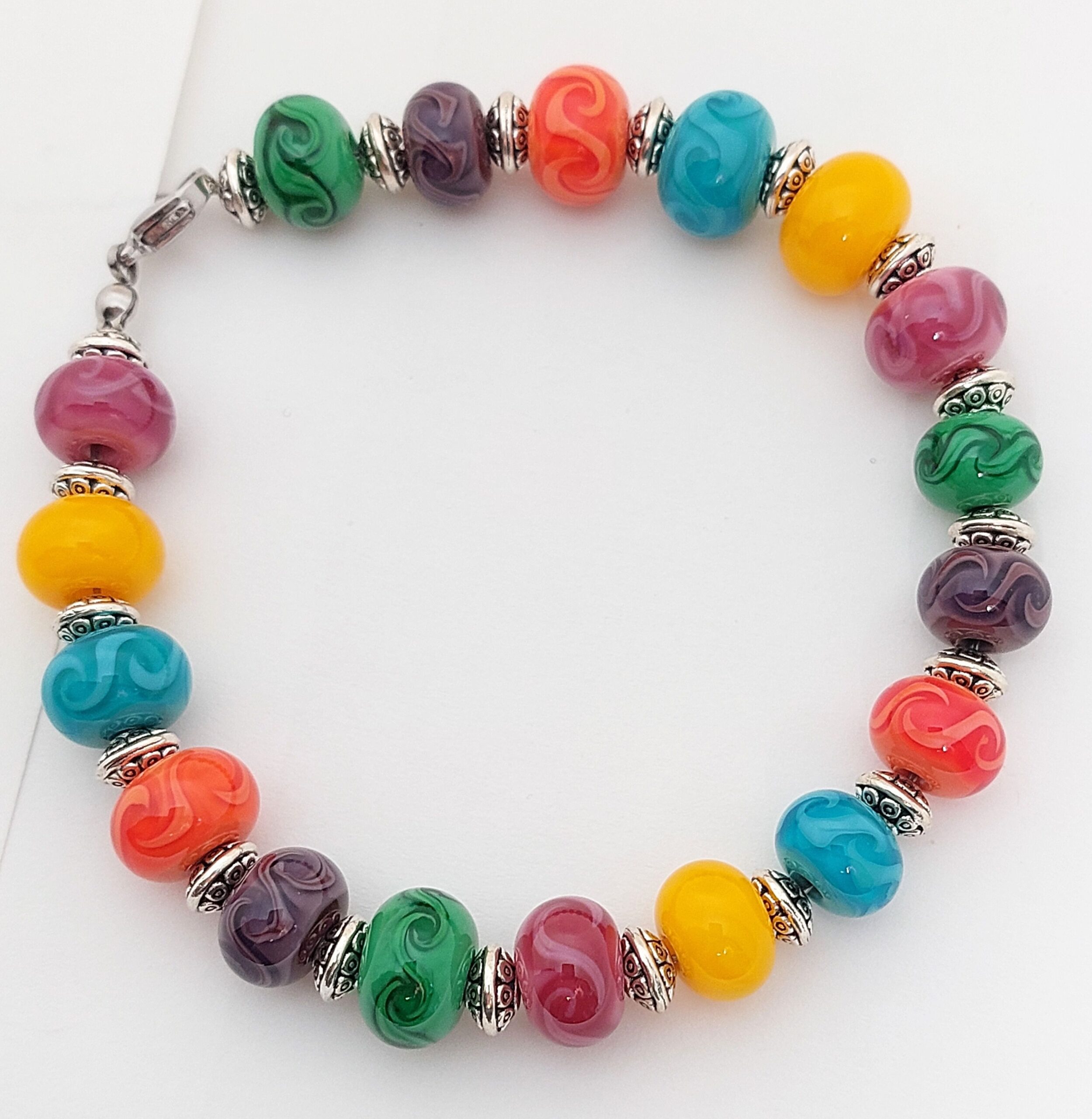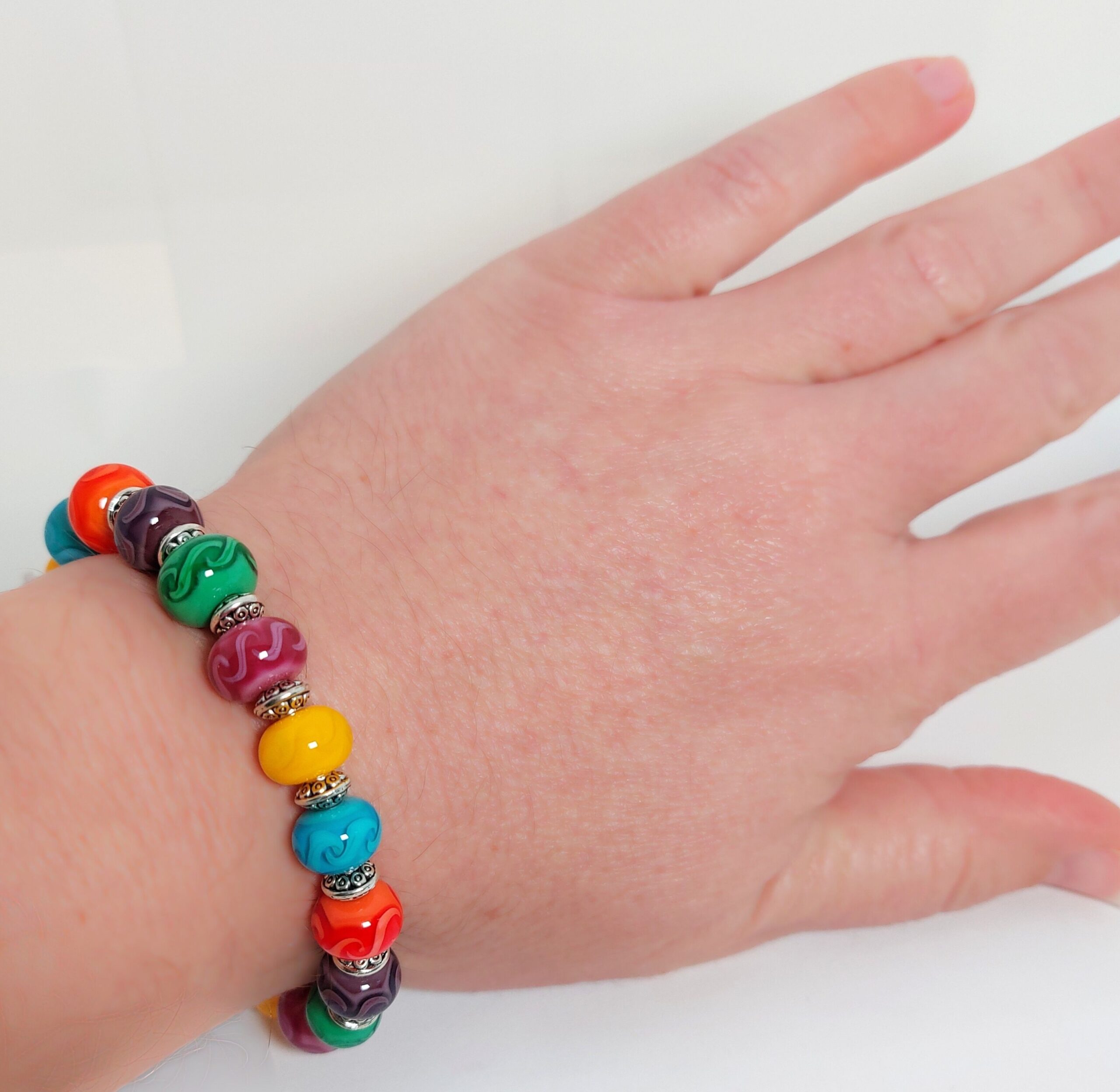 Zilverkleurige rvs armband met kleurrijke glaskraal