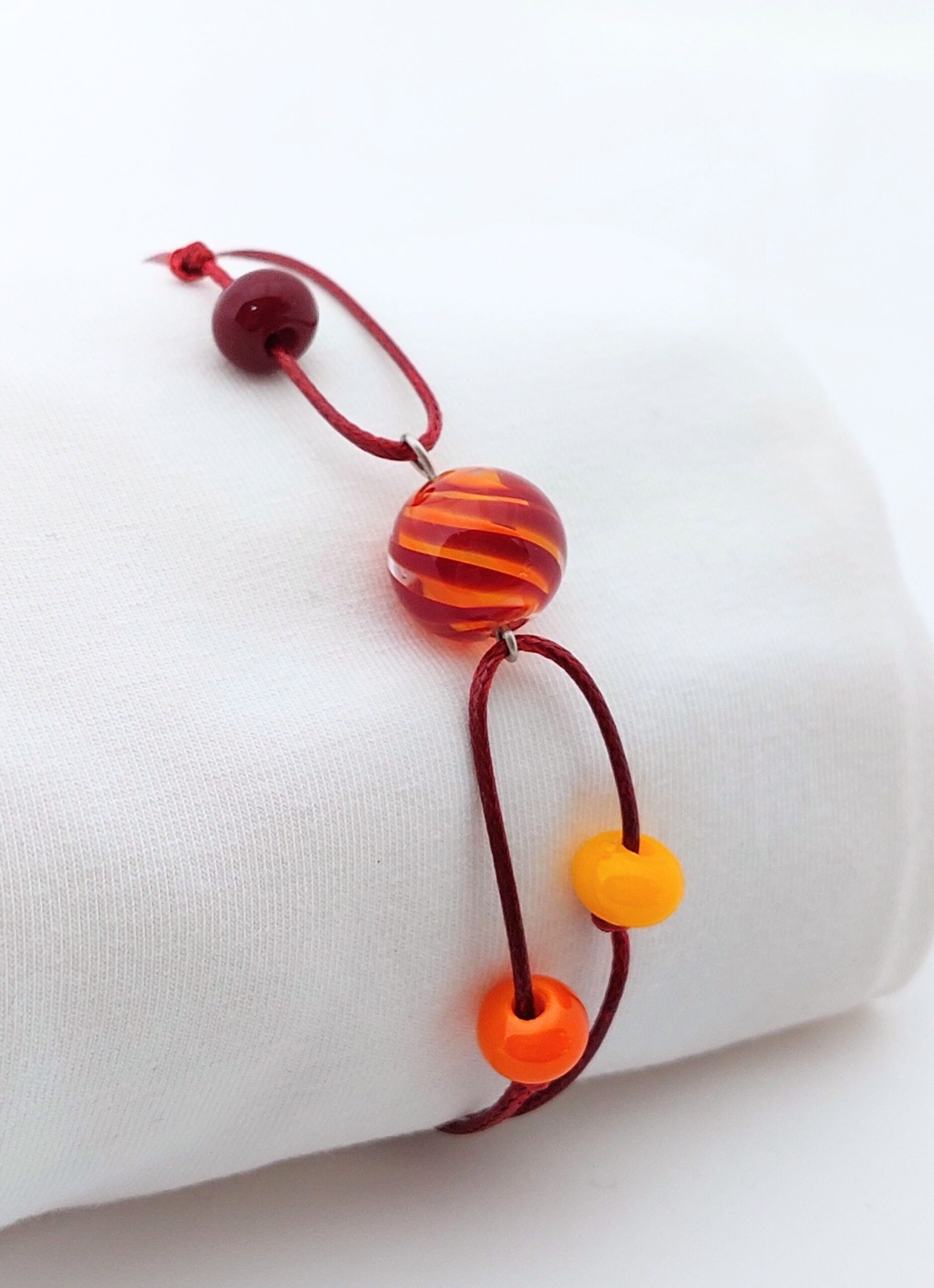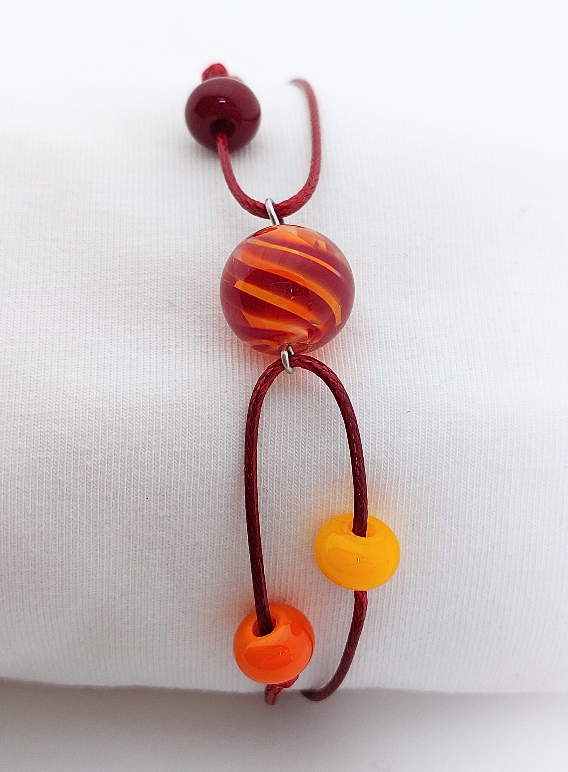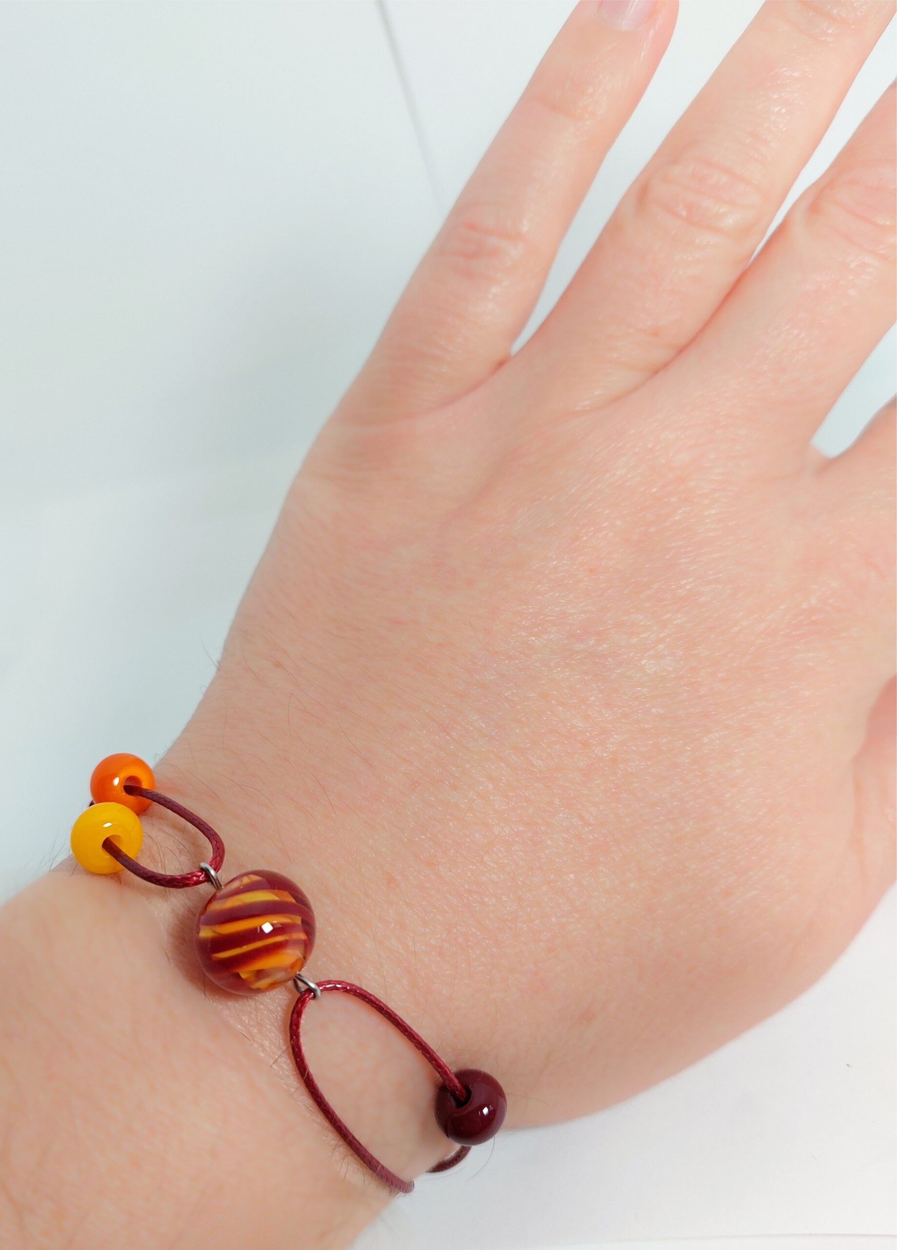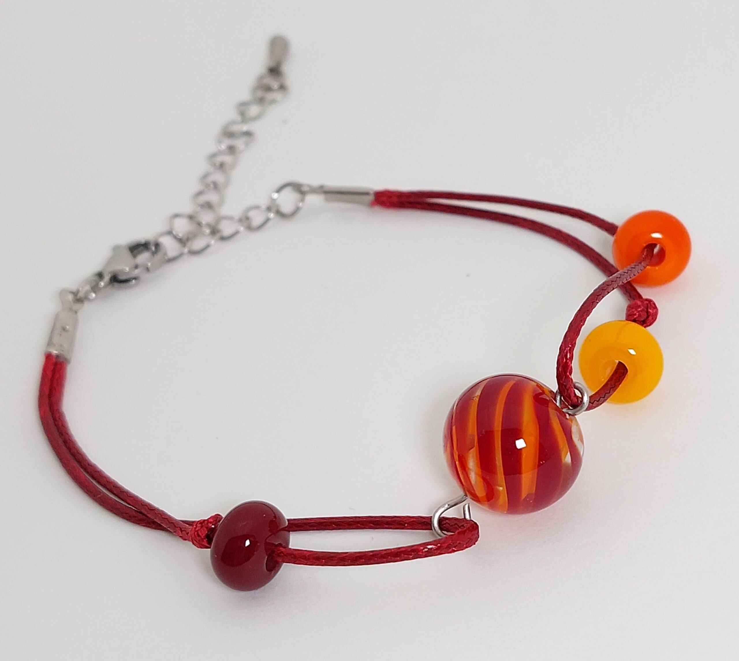 Voor iedereen die net zo van een mooie zonsondergang kan genieten als ik! Deze armband is gemaakt van glanzend rood koord, rvs onderdelen en glaskralen met de kleuren rood, oranje en geel.